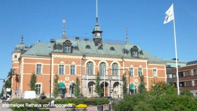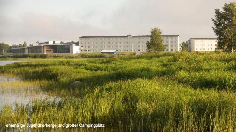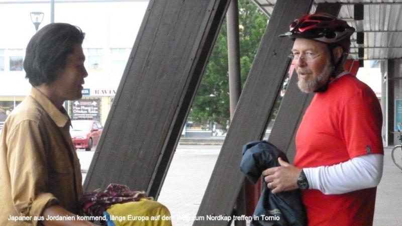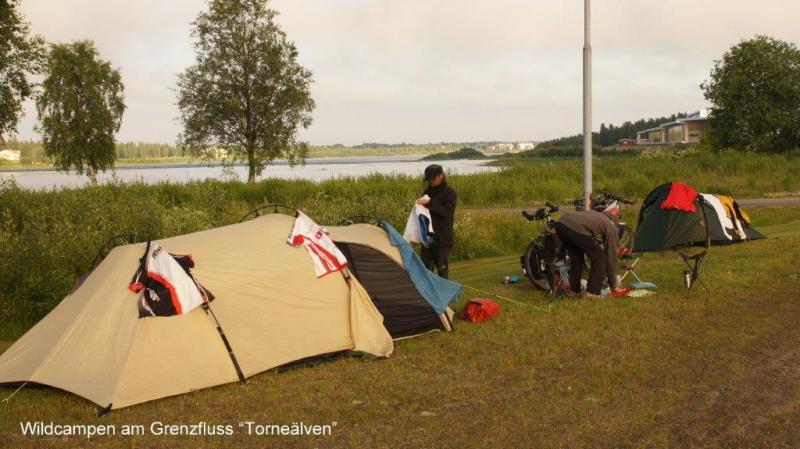 Das Wasser der Dusche ist kochend heiß. Ich muss aufpassen, dass ich mir nicht die Finger am offen verlegten Zuleitungsrohr der Heißwasserleitung verbrenne. Das heiße Wasser ist in allen Campingplätzen in Finnland mindestens 80 Grad heiß. Daher gehe ich überall sehr vorsichtig mit der Mischung kalt-heiß um. In dem sehr einfachen Platz sind die Sanitäranlagen in teilweise primitiven Holzhütten untergebracht. Es reicht um sich frisch zu machen und in der Küche Wasser zu kochen und einigermaßen „mückenfrei“ zu frühstücken. Wichtig ist immer, genügend Frischwasser mitzunehmen. Das ist nur an einem Wasserhahn auf dem Platz möglich. Da der Campingplatz unmittelbar an der Fernstraße 4 liegt, sind wir schnell auf der Strecke und können von dieser verkehrsreichen Straße bald auf gut ausgebaute Fahrradwege und unmittelbar daneben führenden Nebenstraßen Richtung der Stadt Kemi fahren. Hier essen wir nicht nur hervorragend und günstig in einem vietnamesischen Restaurant mit Buffet, sondern wir finden, nach sehr freundlichen Hinweisen, ein gut sortiertes Fahrradgeschäft. Hier erhält Heiner endlich den langersehnten passenden Vorderradmantel für sein in der Stadt Raahe erworbenes neues Vorderrad. Unbeschwert fahren wir der finnisch-schwedischen Grenzstadt Torneo entgegen. Dort verläuft im Fluss Torneälven die Grenze. Der teilt sich so vor der Mündung in die Ostsee auf, dass Torneo auf einer Insel liegt. In der Stadt Haparana auf der schwedischen Flussseite fällt der sehr moderne neue Grenzbereich ins Auge. Beim Blick weiter nach Schweden ist unverkennbar die „Ikeasäule“ mit neuen Einkaufsmärkten zu erkennen. Auf Jürgens Karte und meinem Navi ist sowohl im finnischen Torneo wie auch auf der anderen Flussseite in der schwedischen Grenzstadt Haparanda ein Campingplatz auszumachen. Wir entschieden uns für Haparanda, da wir in Schweden dann gleich Kronen im Geldautomaten ziehen können und in der Stadt nach einer besseren Straßenkarte mit Campingplätzen Ausschau halten können. An zwei Banken ist der Geldautomat außer Betrieb. Die Suche nach dem Campingplatz scheint einfach, da er auf dem Navi wie auch auf der Karte etwas flussabwärts eingezeichnet ist und ab Ortsmitte sogar Hinweisschilder zu sehen sind. Jedoch weit gefehlt. Auf dem vermeintlichen Campingplatz stehen mehrere neue 5-stöckige Blocks, die nicht bewohnt scheinen. Wir fragen Passanten und erhalten die Antwort, dass vor einem Jahr die Campinganlage abgebrannt sei. Kurz entschlossen übernachten wir auf einem frisch gemähten Wiesenstreifen, der nicht zu einem benachbarten Grundstück mit alten Booten und Wohnwagen gehört. Die freundlichen Passanten ermunterten uns dort zu übernachten, da dies eine öffentliche Wiese ist und freies Campen erlaubt sei. Entschieden – getan; aber die Mückenplage bereitet uns, trotz Sonne und Flusslandschaft im Hintergrund, keine Freude. Vorräte fürs Abendessen sind genug vorhanden. Heiner zieht sich schnell ins Zelt zurück und Jürgen und ich fangen die Umgebung mit Fotos bzw. Videos ein. Die wenigen Male, die wir bisher „wild“ gecampt haben, schlief ich immer sehr unruhig. Diesmal nicht. Kaum im Schlafsack war ich im Land der Träume.