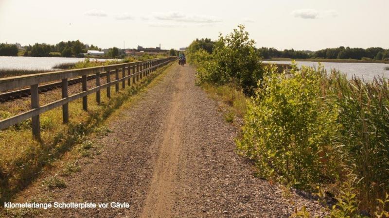 Den gestrigen Ruhetag haben wir zwar zum Waschen genutzt, aber außer Karl-Josef (die Rohloffnabe braucht immer etwas mehr Zuwendung) hat keiner Fahrradpflege gemacht, d.h. wir haben uns wirklich ausgeruht! Hinter einer Staumauer, bzw. auf einer Halbinsel, waren Angler sehr erfolgreich auf der Jagd nach Lachsen. In regelmäßigen Abständen konnten wir wahre Prachtexemplare aus dem Wasser springen oder zumindest an der Wasseroberfläche schwimmen sehen. Leider waren die Angler sehr geschickt und mancher Lachs hatte das Nachsehen. Auf meine Frage hin, warum es denn keine Fischtreppe gebe, hatte mir Martin, der nette Campingplatzwirt, erklärt, dass man wohl in Schweden damit Probleme habe. Da wo man Treppen gebaut hat und den Laichbestand nicht mehr künstlich organisiert habe, gebe es keine Lachse mehr. Aber heute geht es nun wieder weiter. Wir haben strahlend blauen Himmel und nach dem Duschen und Frühstücken wird eingepackt, das leckere Essen von Martin und Heike vom Vorabend wird noch bezahlt. Wir verabschieden uns von den beiden, die uns mit Kölle Helau begrüßt hatten (wegen meinem Köln-Fähnchen am Fahrrad), sich dann aber als überaus nette Gastgeber erwiesen. Ich wünsche ihnen viel Erfolg bei dem Versuch hier in Schweden zusammen mit ihren 5 Kindern Fuß zu fassen. Aber mit ihrer Freundlichkeit und offenen Art werden sie noch viele Sympathien ernten und es bleibt zu hoffen, dass ihnen ein Auskommen mit dem Campingplatz ermöglicht wird. Vom Campingplatz aus sind wir schnell auf einer gut zu befahrenden Landstraße. Es geht entlang einer Eisenbahnlinie und da Eisenbahnen in der Regel keine großen Steige- und Gefällestrecken brauchen können, haben auch wir − bis auf kleine Ausnahmen − eine mittlerweile für uns relativ flache Etappe. Auch wenn es wieder durch schöne Alleen geht, bietet die Strecke nicht wirklich etwas Neues. Wenn ich denn so vor mich hin strample und der Blick wenig Abwechslung bietet, dann schweifen meine Gedanken umher. Sie wandern über verschiedene Erlebnisse unserer Tour, was wird uns an den nächsten Tagen erwarten, was ist zu organisieren, wie wird das Streckenprofil sein, wie die Straßenverhältnisse, wie das Wetter? Stockholm wartet, werden wir einen Platz auf der Af Chapman bekommen? Wie wird es sein, auf einem Schiff zu schlafen, wird es schwanken, wo werden wir unsere Fahrräder sicher unterbringen können? Aber die Gedanken gehen auch weiter. Das Ende unserer Tour rückt näher. Es wird nach der Rückkehr die Situation auf mich zu kommen, mich im „Ruhestand“ organisieren zu müssen, da mein tägliches Berufsleben nicht mehr gegeben ist. Vor dem Start unserer Tour war so viel zu erledigen, dass es einen strukturierten Tagesablauf nicht geben konnte. Es gibt so viele Ideen, die in mir schlummern, was ich alles machen möchte / könnte. Meine Schwiegermutter ablösen in der Gartenarbeit wird mir wichtig sein, da ich hierbei vergleichbar mit dem vor mich Hinradeln – ähnlich einer Meditation – Gedanken kommen und gehen lassen und Entspannung finden kann. Bei meinen früheren längeren Reisen war es immer so, dass ich mein Fahrrad für einige Zeit dann nicht mehr angepackt habe. Aber es würde mir schon Spaß machen, mich meinem Freund Ferdi anzuschließen und mittwochs Fahrradtouren mit dem ADFC (Allgemeiner deutscher Fahrradclub) zu fahren. Elisabeth zum Aquajogging zu begleiten wäre eine Möglichkeit. Die Vorstellung im sozialen Bereich mich zu engagieren möchte ich umsetzen. Das Berufsleben auf Sparflamme noch eine Weile fortzusetzen, verschiedene Renovierungsarbeiten angehen und vieles mehr wandern durch meinen Kopf. Aber auch im Hier und Jetzt kreisen die Gedanken. Auf den Strecken, die wir fuhren, sind wir nur auf wenige Dörfer und Städte gestoßen. Es überwiegen einzelne, sehr abgelegene Häuser oder Höfe. Wenn ich ein verstecktes Häuschen entdecke, dann kommt immer die Frage auf, ja von was leben diese Menschen denn? Brauchen diese Menschen keine Kommunikation, die Unterstützung mit-/untereinander? Wie ist es für die Kinder, wenn sie es kilometerweit bis zum nächsten Freund haben, wie kommen sie in die Schule? Auf den Verbindungsstraßen die wir fahren, gibt es manchmal Strecken von 70-80 km, bis zur nächsten Einkaufsmöglichkeit. Aus dem Hinterland werden dann schnell mehr als 100 km, um einkaufen zu können. Wie schaffen diese Menschen es im Winter, bei minus 30° C versorgt zu sein? Zurück zu unsere Radelstrecke vom heutigen Tag. Da wir in Schweden zu 90 % Wege und Straßen durch Wald fahren, fällt uns auf, dass die Schweden immer ganze Lichtungen abholzen und nicht wie bei uns in Deutschland selektiv. Da es nach Aussage von Schwedenkennern kein Land gibt, in dem so viel Erfahrung mit der Holzwirtschaft vorliegt, wird es anscheinend bei uns nur aus optischen Gründen anders gemacht. Die komplette Rodung ist sicher die wirtschaftlichste Variante. Es wird aber auch gezielt nachgepflanzt, wie wir beobachten konnten. Vor der Stadt Gävle fahren wir mehrere Kilometer nur Schotterwege und kommen dann aber in eine unerwartet moderne Wohnbebauung, die fast schon mediterranes Flair zu bieten hat. An einem Flusslauf sehen wir in einiger Entfernung eine Schaukel, mit der sich Jugendliche hoch in die Luft katapultieren um dann mit Salto in das große Becken eines Ostseekanals einzutauchen. Auf den weiteren ca. 10 km bis zu unserem Zeltplatz Furuvik entdecken wir parallel zur Straße eine Leitung verlaufen. So etwas habe ich noch nie gesehen, sie besteht mit ca. 1.200 mm Durchmesser aus Holz und wird durch Eisenringe, ähnlich unseren Weinfässern, in runder Form gehalten. Diese Leitung begleitet uns über mehrere Kilometer und sogar Übergabetürme gibt es, vermutlich, um Höhenunterschiede auszugleichen. Der Campingplatz in Furuvik liegt direkt neben einem großen Tierpark, so dass hier viele Familien das beginnende Wochenende nutzen, um den Park zu besuchen und mit den Kindern hier zu übernachten. Dementsprechend voll 