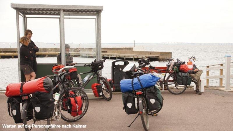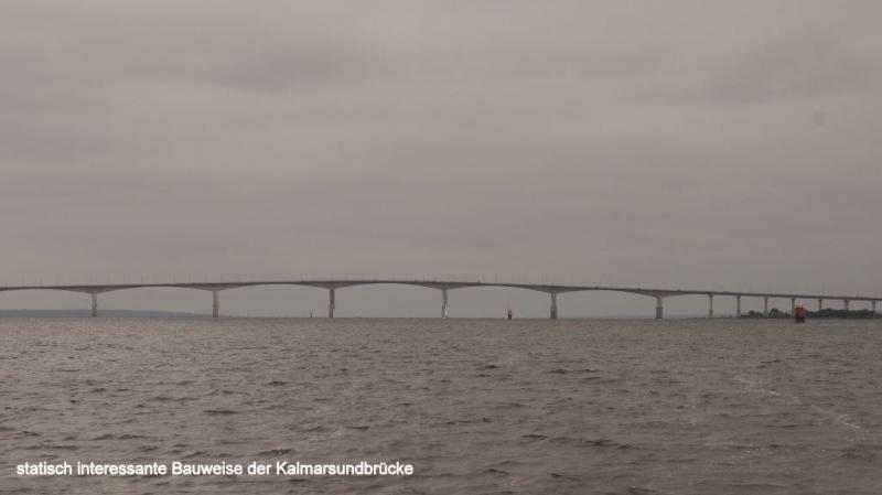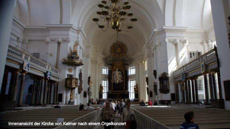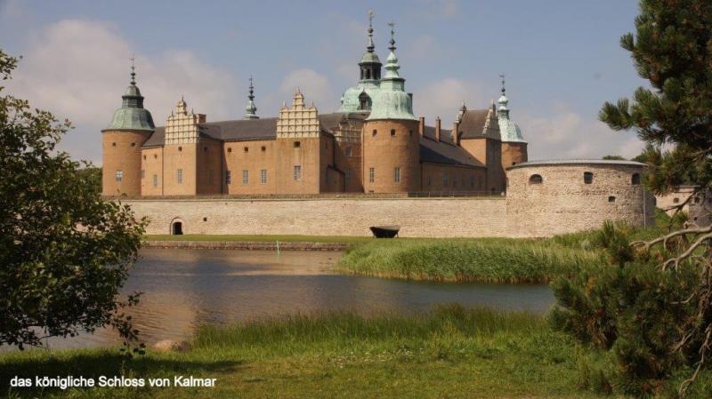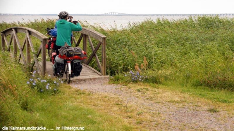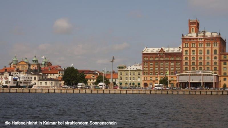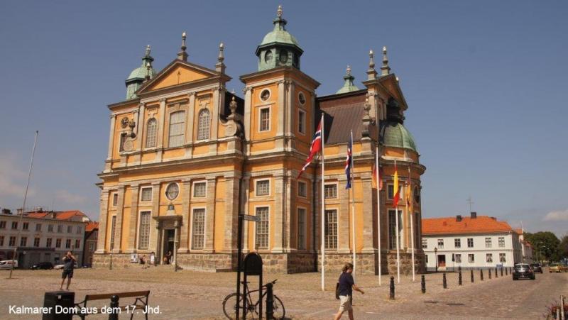 Auf den Campingplätzen Ölands ist die Hölle los. Wir fragen uns, wieviel Urlaub haben die Skandinavier eigentlich, dass die Plätze so gerammelt voll sind. Was mich verwundert, ist, dass genau in dieser Zeit auch Schweden im Rentenalter diese Ferienzeit nutzen, obwohl sie ja ab Mitte August mit Ende der Sommerferien es deutlich ruhiger haben könnten. Aber vielleicht ist es gerade ein solcher Rummel den sie brauchen, zum Ausgleich zum ansonsten einsamen Leben und Wohnen in zersiedelten Gegenden. Öland mit seinen Sandstränden hat da sicherlich einen besonderen Reiz. Fährt man über die Nebenstraßen ist Öland wunderschön, mit seinen größeren und vielen kleineren Windmühlen, die, wie wir vermuten, möglicherweise in früheren Zeiten als Pumpstationen für die Bewässerung der Felder gedient haben könnten. Die Insel ist angenehm mit dem Fahrrad zu befahren, da es kaum Steigungen gibt. Bis auf wenige kleinere Städte und Dörfer gibts fast ausschließlich nur Landwirtschaft. Ausnahmen bilden einige wenige Fischerdörfer und Kalksteinbrüche, die wir mehrfach antreffen. Korallenriffe und Muschelkalk aus den Urzeitmeeren sind hier wohl derart verfestigt worden, dass Kalkblöcke geschnitten und als Baumaterial verwendet werden können. Typisch für die Landschaftsgestaltung sind mit Steinmauern umgrenzte Wiesen, die zum Teil auch mit rundgeschliffenen Granitsteinen dekoriert sind. Vermutlich als Geröllmasse mit dem Rückgang der Eiszeit als Findlinge hier zurückgelassen. Von Ekerum (Nähe Rälla) als Übernachtungsplatz starten wir nach Färjestaden. Vorbei geht es an bereits erblühenden Heideflächen, zunächst über die Landstraße 136, die die Hauptverbindungsachse der Insel Öland bildet. Ca. 10 km vor Färjestaden gibt es aber eine ruhige Nebenstraße. Wir fragen uns zur unscheinbaren Ablegestelle einer Personen- und Fahrradfähre durch, da wir mit unseren Rädern nicht die 18 km lange Kalmarsundbrücke nutzen dürfen. Diese sehen wir als sehr filigran und statisch ausgeklügeltes Bauwerk nur aus der Ferne. Um auch größeren Schiffen die Durchfahrt durch den Kalmarsund zu ermöglichen, ist die Brücke festlandseitig mit einem hohen Bogen ausgeführt. Wir müssen noch etwas warten auf unsere Fähre und es wird erforderlich, uns noch etwas über zu ziehen, da seeseitig ein kalter Wind bläst und es von Osten zunehmend eintrübt. Die ganze Insel zieht sich relativ schnell zu und es sieht nach Regen aus. Auch die beiden Frauen vom Campingplatz in Ekerum, mit denen wir uns gestern Abend unterhalten hatten kommen angerollt, um die letzte Fähre um 11:00 Uhr vor der Mittagspause bis 13:30 Uhr zu nehmen. Die Überfahrt kostet rd. 5 € und dauert auch nur knapp 30 Minuten. Was wir zwar von der Insel Öland schwach erkennen konnten, stellt sich nun als Gewissheit heraus. Kalmar liegt im strahlenden Sonnenschein und bleibt auch für den Rest des Tages so. Wir können unser Glück kaum fassen. Vom Hafen führt der Weg zunächst zum königlichen Schloss. Es ist der besterhaltene Renaissance-Palast in Nordeuropa und steht auf einer kleinen Halbinsel an der Ostseeküste. Durch einen Burggraben ist er vom Festland getrennt. Etwas mehr Probleme haben wir dann die Altstadt zu finden, da wir dem Navi mehr vertrauen, als den städtischen Wegweisern. Mittelpunkt der Altstadt ist der Kalmarer Dom, der als besterhaltene Barockkirche Nordeuropas gilt und nach Vorbildern aus Italien und Frankreich im 17. Jhd. errichtet wurde. Wir bekommen noch einen kleinen Rest von einem täglich um die Mittagszeit stattfindendem Orgelkonzert mit. Es gibt 4 verschiedene Orgeln, die sich in der guten Akustik der Kirche sehr gut entfalten können. Da wir es heute gemütlich angehen, besuchen wir noch ein Café um einen Kaffee zu trinken und genießen obendrauf noch ein Stück leckeren Streuselkuchen mit viel Sahne.