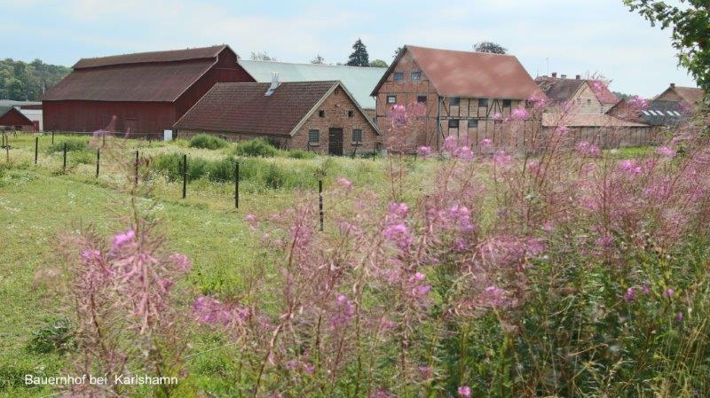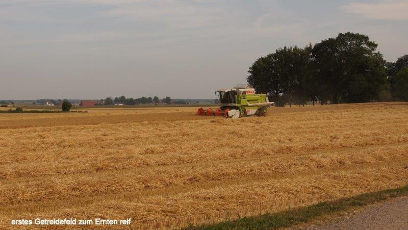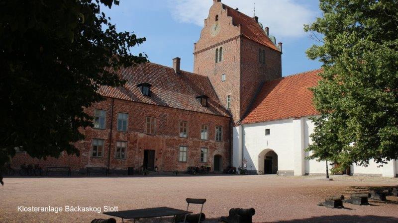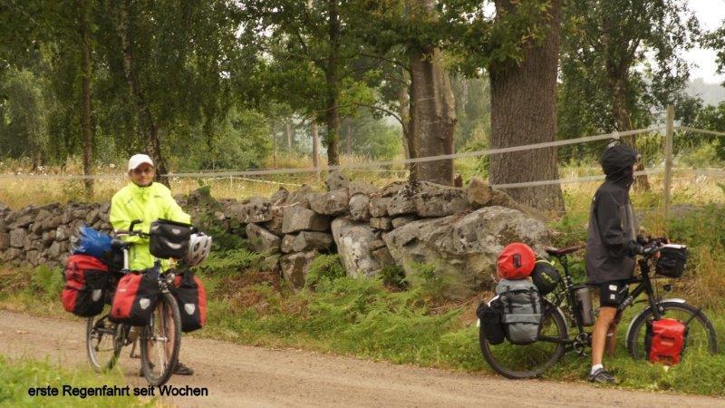 Nachts hatte es nur leicht geregnet. Das Zelt war noch etwas feucht. Das frühe Aufstehen am Sonntagmorgen um 06:15 Uhr hat den Vorteil, dass die drei Duschen nicht besetzt sind und der gesamte Raum für Heiner und mich zur Verfügung steht. Die Sonne hatte wieder die Wolken vertrieben, wärmte uns aber nicht an unserem Frühstücksplatz unter dem riesigen Vordach der Campingplatzküche. Das Frühstück wurde mit gespannter Ruhe eingenommen, da nicht klar war, ob Heiners Hinterrad mit Speichenbruch die heutige Tour überstehen würde. Heiner packte mehr auf die Vorderradtaschen und ich nahm diesmal zusätzlich zu meinem Gepäck das Zelt, um auch für Entlastung zu sorgen. Die Route verlief zuerst nördlich bis Asarum. Hier erwartete uns wieder eine weite intensiv bewirtschaftete Landschaft mit großen Bauernhöfen. Der Hof, der mir sehr auffiel, war in Ziegelstein gemauert und besaß nicht, wie bisher hier in Schweden beobachtet, den üblichen Blockhausstil mit der typischen eisenroten Farbe. Es war zwischenzeitlich sehr heiß geworden und ein leichter Wind kam auf. An einem Stück Brachland wehen uns von rechts aus einem schneeweißen Kamillenfeld Blütenpollen entgegen. Es riecht nach einem Aufguss mit Kamillentee, den ich sehr liebe. Über den Cykelspåret erreichen wir Mörrum, ein Zentrum für den Lachsfang am Fluss Mörrumsån. Wir haben jedoch keinen Angler gesehen. Westlich von Näsum überqueren wir den Fluss Holejån. Dann können wir zwischen dem riesigen Ivösjön See und dem Oppmanna-See fast 10 km entlangfahren, finden fast am Ende der Strecke das Schloss Bäckaskog Slott, eine Klosteranlage aus dem frühen 13. Jahrhundert. Es wurde von Prämonstratensermönchen gegründet und im Reformationsjahr 1537 aufgelöst und vom dänischen Staat als Adelsgut übernommen. Im 18. Jahrhundert war es eine königliche Sommerresidenz und wird heute als „Schloss der Rosen“ mit einer sehr großen Parkanlage geführt. Ein Besuch lohnt sich auf jeden Fall. Der Ivösjön See ist ca. 10 km lang und macht auf mich zunächst den Eindruck als sei er einer der vielen Ostseefjorde. In der Karte näher hingesehen, erweist er sich als selbständiger Süßwassersee der vom Fluss Holejån gespeist wird und seinen Ablauf nach ca. 5 km beim Ort Bromölla in die Ostsee findet. Wir durchfahren das Zentrum der Obstplantagen Südschwedes. Die Landschaft bleibt hüglig mit langsamen Steigungen und Abfahrten. Kurz vor unserem Tagesziel entdecken wir den ersten Mähdrescher, der ein Gerstenfeld erntet. Von Norden nach Süden haben wir den zunehmenden Reifegrad der Getreidefelder erlebt und nun steht die Ernte an, die uns wahrscheinlich auf unserer weiteren Wegstrecke jetzt begleiten wird. Die Gerstenfelder sind immer ein besonders schöner Anblick, wenn der Wind die langen Halme wellenartig überstreicht. Oder anders ausgedrückt, wie der Wind der durch das Haar einer schönen blonden Schwedin streicht. Verlassen wir romantische Gedanken und kehren zur Strecke zurück. Um es zu verraten, Heiner hat mit seinem defekten Gefährt die Strecke bis zum Zielort Kirstianstad mühelos überstanden. Es war wieder sehr heiß, als wir an einem kleinen Campingplatz mit Jugendherberge unsere Tour beendeten. Morgen hoffen wir auf eine schnelle Reparatur des Speichenbruchs. Nach einer erfrischenden Dusche, die Strecke war wegen der Witterungsverhältnisse und dem zusätzlichem Gepäck für mich sehr anstrengend, aßen wir reichlich und gut zu Abend. Mit den Gedanken „wie problemlos wird wohl die Reparaturwerkstatt zu finden sein und wird es möglich sein die seit längerem immer stärker wackelnde Federstütze des Sattels auszutauschen“ schlafe ich schnell ein.