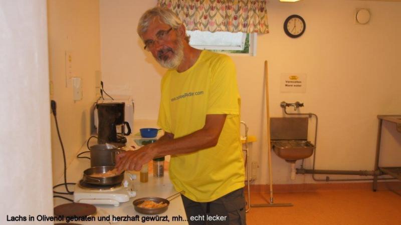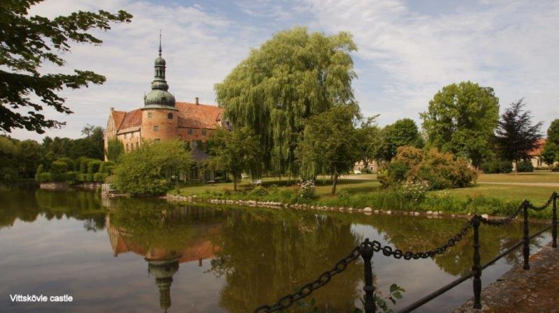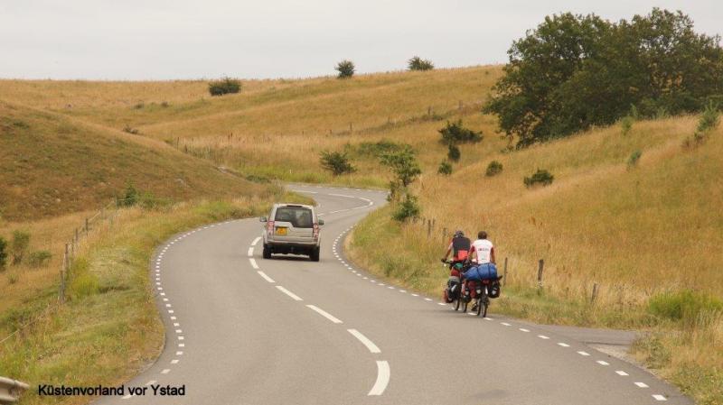 Es ist morgens diesig und kein Trockenwetter. Wir legen unsere Thermarestmatratzen auf die Holzbänke, auf den feuchten Holztisch ein großes Kunststoffbrett aus der Küche. Zitiert wird heute Morgen Ellens erheiternder Leserbrief. Besonders weist Karl-Josef auf das Lob Jürgens hin, der die Vorgänge auf den Campingplätzen so ausführlich zu beschreiben vermag. Es entbrennt darauf eine Diskussion über Umfang, Form und Inhalt der Blogs. Nach dem Frühstück übernehmen Karl-Josef oder ich das Spülen, während Jürgen danach mit dem aufwendigen Verstauen des Koch- und Essgeschirrs beschäftigt ist. Nach Verlassen des fast schon als einsam erlebten Campingplatzes an der Jugendherberge hat Jürgen nur einige hundert Meter entfernt eine Reparaturwerkstatt für Kleinkraft- und Fahrräder entdeckt. Das Ausleihen von Werkzeug ist nicht möglich, aber die Reparatur meines Rades wird vorgezogen und nach einer halben Stunde ist mein Hinterrad wieder für ca. € 25 repariert. Karl-Josef bekommt eine neue Sattelstütze. Das defekte Federrohr des Sattels kann nicht repariert werden. Es geht weiter Richtung Süden. An einem wunderbaren Schloss in Privatbesitz machen wir Mittagspause. Vittskövle castle ist eines der besterhaltenen Renaissanceschlösser des Nordens und erhielt sein heutiges Aussehen in den Jahren 1553-1577. Zum Schloss gehören ein englischer Garten und mehrere ältere landwirtschaftliche Gebäude sowie das längste Alleen-System in Schweden. Wir kommen durch den malerischen Fischer- und Badeort Kivik und machen eine längere Fotopause, in der ich ein wenig Schlaf nachhole. Da es mittlerweile bereits 16:30 Uhr ist, beschließen wir auf dem örtlichen Campingplatz zu bleiben. Es handelt sich um einen Campingplatz der berühmten 4-Sterne-Kette und wir zahlen umgerechnet € 10 pro Person. Abends fängt es an zu nieseln. Der Regen hält die ganze Nacht an. Wir können uns gut in dem der Küche angeschlossenen Aufenthaltsraum aufhalten. Heute gibt es von Karl-Josef und mir Reis, Spinat und Lachs. Das Bier ist durch den gefrorenen Spinat und Lachs gut gekühlt. Ich lege mich früh hin und höre nachts nur noch einige Frauen laut quatschen, die wohl zur Toilette wollen.