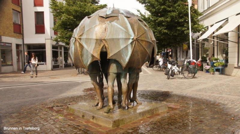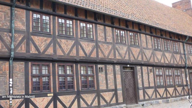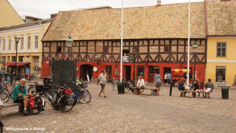Als ich um 6 Uhr duschen gehen will, fehlt die Eintrittskarte. Karl-Josef hört mich, sucht in seinen Sachen und findet auch die Karte. In den Sanitäranlagen fällt mir eine Verhaltensanweisung auch in deutscher Sprache auf. Im letzten Satz folgt ein Danke für die „freundliche Kollaboration“. Haben wir denn immer noch Krieg, frage ich mich. Für uns ist der Begriff ja sehr negativ besetzt. Auf gehts nach dem Frühstück in die Innenstadt von Trelleborg, in der es die einzige Palmenallee Schwedens gibt. 1984 wurden die ersten von heute 100 Palmen aus Spanien angepflanzt, die sich im Winter im Palmenhaus drängen. Trelleborg wurde 1257 zur Stadt ernannt. Der Heringshandel in der Ostsee spielte eine wichtige Rolle. Die Malmöer wollten die Konkurrenz loswerden und beklagten sich so lange beim König in Kopenhagen, bis König Christian im April 1619 den Klagen nachgab, die Stadtrechte und das Recht der Kaufleute und Handwerker ihren Beruf auszuüben, entzog. Erst 1867 erhielt es die Stadtrechte zurück. Trelleborg baute den Hafen aus und wurde als zweitgrößter Hafen Schwedens zu einer Wiege der Speditionsbranche mit einem jährlichen Umschlagsvolumen von über 10 Millionen Tonnen. Die Stadt hat ihren Namen nach der gleichnamigen Wikingerburg. „Trelleborgen“ kommt aus dem Dänischen, „trelleborgar“ gleich Ringburg. Die von uns auch aufgesuchte Ringburg hatte einst einen Durchmesser von 140 m. Ich entdecke im hinteren Teil des Burggeländes auch noch eine nachgebaute Wikingeransiedlung mit zwei, die Jahrhunderte wohl überlebenden, Wikingern in ihren Bärenhäuten. Vor der Burgbesichtigung haben wir mithilfe des Rechners des Touristenbüros nach Übertragen unserer Blogs auf einen Stick es geschafft Ina die neuesten Nachrichten zu senden. Der kostenlose WiFi im Büro war überfordert. 14:30 Uhr haben wir endlich Malmö erreicht und fragen uns zum malerischen Stadtkern durch. Jürgen kauft noch schnell einen Ersatz für den mir abhanden gekommenen Campingsitz mit der Bemerkung, ich sei mit meiner Vorliebe für Bänke und Tische ja schon zu einem Saloncamper geworden. Tatsächlich kann ich das Dreibein noch am selbigen Abend gut gebrauchen. Dann picknicken wir vor den alten Fachwerkhäusern und trinken anschließend noch einen Kaffee.