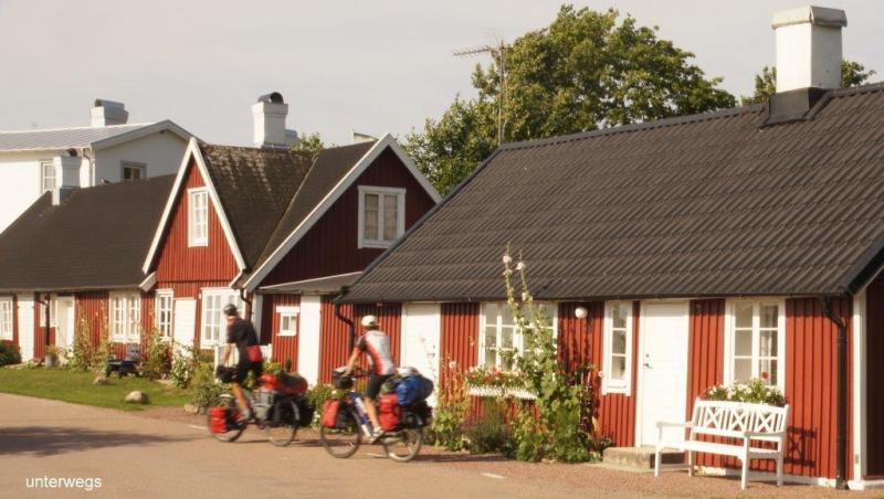 Wenn ich am frühen Morgen die Augen aufmache, erfolgt die örtliche Orientierung. Was ich sehe ist immer gleich. Freund Heiner rechts und die gelbliche Zeltdecke über mir. Wo das Zelt steht ist auch an den Geräuschen festzumachen. Straßenverkehr, Schritte über den nahen Fußweg oder nur das Geschrei der Möwen oder sonstiger Vögel. Diesmal war es sehr ruhig. Weit entferntes Möwengekreische und selten ein langgezogenes, aber tieferes Geräusch eines vorbeirauschenden Zuges. Richtig, wir hatten unser Zelt auf einer höher gelegenen Wiese am Meer aufgebaut, da der Campingplatz für Zelte nicht mehr aufnahmefähig war. Der nächste Gedanke galt dem Wasser. Katzenwäsche ist noch möglich und Wasser für Kaffee sicherlich genug vorhanden. Gestern Abend hatten wir vorgesorgt. Zelten in freier Natur, das ist nicht nur Pfadfinderromantik, sondern immer wieder ein Erlebnis wenn – und das ist für jeden „modernen Menschen“ heute wichtig – bestimmte Grundbedürfnisse gestillt werden können. Dazu gehört Essen und Trinken und natürlich auch die Hygiene. Am Morgen hatte Jürgen unseren Benzinkocher (der leider nicht gut funktionierte – Jürgen berichtete darüber in einem zurückliegenden Blog) trotz aller Widrigkeiten dazu gebracht, heißes Wasser für unseren Nescafé zu erzeugen. Die schon gelobte Blümchentischdecke wurde auf dem Gras ausgebreitet und alles Vorrätige darauf verteilt. Ringsherum war alles genutzt, was zum hoch- oder festhalten feuchter Kleidung zwecks schneller Trocknung zur Verfügung stand. Kurzum, das Frühstück war wie immer, die Natur mit Blick auf die Ostsee wunderbar. Eins möchte ich nicht verschweigen, der morgendliche Gang auf ein „stilles Örtchen“ gestaltete sich im buschig steilen und steinigen Gelände am Ufer anders und zur Hygiene wird danach ebenfalls Wasser benötigt. Hier möchte ich mit meinen Beschreibungen enden, ohne nicht noch einen Punkt unserer fast nun 100-tägigen Reise beim nur wenige Male erfolgten freien Campen zu erwähnen. Strom haben wir an diesen Plätzen nicht. Das heißt Batterien können nicht aufgeladen werden und das Notebook zum Schreiben der Blogs funktioniert nicht. Ich hatte bei diesen Gelegenheiten immer Zeit, Streifzüge in der unmittelbaren Umgebung mit Tier und Pflanzenbeobachtungen durchzuführen und mit Ruhe viele Fotos zu schießen. Fazit, alles ist eine Frage der guten Vorbereitung und sicheren Ausrüstung beim „Wildcampen in freier Natur“. Zeltabbau und Packsäcke aufs Fahrrad erfolgte recht schnell und so waren wir früh auf dem Sattel. Unsere Route verlief zunächst auf dem bekannten Cykelspåret. Wir entschieden uns jedoch den Bogen längs der Küste nicht zu folgen, sondern um schneller voran zu kommen, weiter ins Landesinnere zu fahren. Das bedeutet auch hier, hoch über die hüglige Landschaft eine Steigungen von einmal 7 % von 10 m über Meereshöhe auf 130 m. Zusätzlich blies uns ein stetiger Wind entgegen. Dieses nahmen wir in Kauf und kürzten die Strecke wegen der vorgelagerten Landzunge zwischen den Orten Vejbystrand und Bastad entscheidend ab. Nun führte unser Weg wieder an die Küste. Im Landesinneren bestimmten goldreife Kornfelder das Bild. An der Küste erleben wir das bekannte Bild der sonnenhungrigen Strandbesucher und verträumte kleine Häfen. Wir durchqueren die Kleinstadt Halmstad an der Mündung des Flusses Nissan und fahren einen Campingplatz an der Landstraße N610 an. Eine sehr neue parzellierte Anlage erwartet uns. In den Zeltaufbau prasselt ein kurzer Regen und sorgt etwas für Hektik und eine nasse Zeltunterlage. Alle Packsäcke kommen ins Zelt und die Sonne hat nach 20 Minuten alles wieder aufgetrocknet. In der modernen Küche mit viel Platz und Sitzgelegenheiten wird das Abendessen eingenommen und dann noch bis in die späten Abendstunden am Text für den Blog gearbeitet und es werden Fotos bewertet und den Berichtstagen zugeordnet und beschriftet. Nun sind wir wieder ein gutes Stück näher an Göteborg heran und damit rücken die Überfahrt nach Dänemark und der Weg in den Süden und damit nach Hause näher.