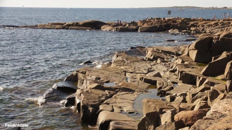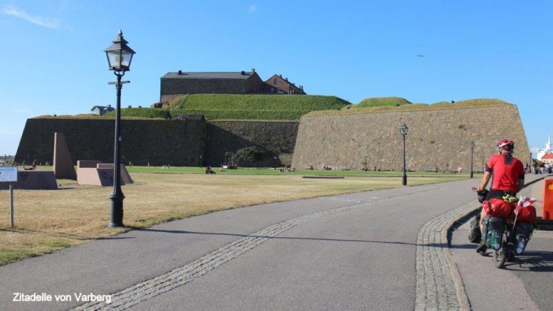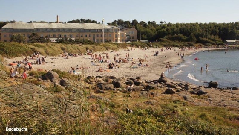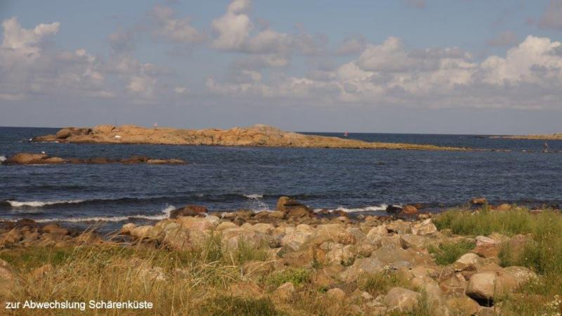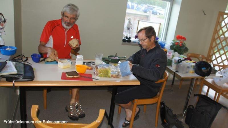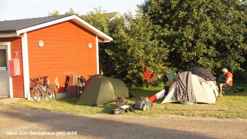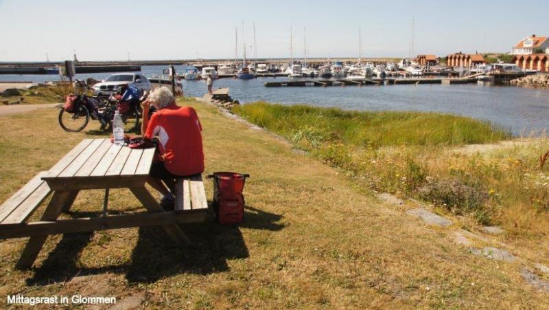 Nach dem Duschen kann ich mich noch hinlegen, da die Küche erst ab 7:00 Uhr geöffnet ist. Die Küche ist luxuriös mit schöner Sitzgelegenheit. 10 Uhr ist Abreise, 10:30 an einem schönen Strand der erste Halt zum Fotografieren. Uns faszinieren besonders die schönen Felsformationen. Die Sonne brennt schon vom Himmel und ganz Schweden scheint sich jetzt am Strand und im Wasser aufzuhalten. In Falkenberg fragt Karl-Josef um 13:00 Uhr an, ob wir Mittagspause machen könnten. Wir beschließen aber noch weiterzufahren, bis Jürgen um 14:00 Uhr am Hafen in Glommen eine passende Holzbank für unsere Mittagspause gefunden hat. Die Gegend um Falkenberg, so lese ich später, hat eine der größten Konzentrationen von Silber- und Münzschätzen aus der Wikingerzeit von Anfang des neunten Jahrhunderts, erfahre ich in der Jugendherberge auf Wikipedia. Am Hafen beobachten wir, wie ein Ehepaar ein Boot auf einem Anhänger ins Wasser rollen lässt. Ein anderes wird mit einem großen Hebekran ins Hafenbecken heruntergesenkt. Aufgrund der deutschen Autos der Oberklasse, den Häusern, den Campingwagen und Booten, erscheint mir der Wohlstand hier an der Westküste noch größer als an der Ostküste Schwedens zu sein. Um 16:30 Uhr kaufen Karl-Josef und Jürgen in einem Supermarkt von COOP ein! Sie wollen sich heute um das Abendessen kümmern. „Oppet alla dagar 7 -21“ lese ich auf dem Coop-Gebäude. Die Supermärkte sind hier wirklich riesig und nach dem Gedränge zu urteilen, scheint Sonntag der beste Einkaufstag zu sein. Um 18:30 Uhr erreichen wir Karradals Campingplatz. Gegenüber der Rezeption steht ein Restaurant und Jürgen spendiert einen halben Liter Bier, weil heute Sonntag ist. Der uns zugewiesene Zeltplatz steht praktisch direkt neben den Sanitäranlagen. Die Küche ist allerdings auf der entgegengesetzten Seite des Platzes angesiedelt. Aber dafür haben wir ja Fahrräder. Ich beginne mit meinem nächsten Blog und die Jungs begeben sich in die Küche. Die der Küche angeschlossene Sitzgelegenheit ist eher als schlicht einzustufen. Dafür werden wir aber mit moderner Musik berieselt und es gibt zum Abendessen einen sehr wohlschmeckenden Eintopf aus Reis, Erbsen und Tunfisch. Um 22 Uhr werden wir von der Reinigungsfrau genötigt, die Einrichtung zu verlassen. Mangels Sitzgelegenheit für die Fortsetzung meines Blogs lege ich mich jetzt auch gerne schlafen.