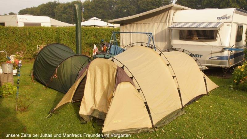 Wie verzweifelt waren wir gestern Abend, als wir hinter Eckernförde keine Übernachtungsmöglichkeit sahen. Und wie wendete sich unsere Aussichtslosigkeit zum traumhaften Abend. Heiner berichtete gestern ja bereits ausführlich darüber. Selbst die Schnecken, die uns beim mitternächtlichen Aufsuchen des Zeltes in ganzen Bataillonen ums Zelt krochen, konnten uns nicht von einem sorgenfreien Schlaf abhalten. Gut, zwei Schnecken hatten es bis in Heiners Lebensmitteltüte geschafft und versuchten im Vorzelt unserer Gastgeber sich heute Morgen in Sicherheit zu bringen. Aber hier hatten sie natürlich nicht mit dem erfahrenen „Katapultierer“ Heiner gerechnet, der in gewohnter Weise (mir ist leider entfallen, ob es wieder ein Plastiklöffel war, ich meine aber nicht!) diese in die Weiten des unübersehbaren Campingplatzes beförderte. Die Gastfreundschaft von Jutta und Manfred hält auch am Morgen noch an und wir dürfen uns in bequemen Campingstühlen an einen gedeckten Tisch im Vorzelt setzen. Jutta würde am liebsten sehen, dass wir uns an den Dingen bedienen, die sie so alle aus diversen Schränken und Ecken herbeizaubert, aber wir haben ja noch selber genug zum Frühstück eingekauft. Gut gestärkt machen wir uns dann ans Einpacken und ich gehe noch einen kleinen Beitrag fürs Duschen beim mittlerweile angekommenen Platzwart bezahlen. Das Zelten ist umsonst, da wir ja bei Juttas und Manfreds Stellplatz gezeltet haben. Wir verabschieden uns von unseren Gastgebern und machen uns auf den Weg über die Kreisstraße K16 nach Strande, Friedrichsort, Holtenau und kommen nach Kiel. Unterwegs begegnet uns, wie Heiner gestern bereits erwähnt hat, Herr Kubicki mit Gefolge auf Werbetour für die anstehende Bundestagswahl. Da ich als Erster fahre und Herrn Kubicki sofort erkenne rufe ich ihm spontan zu: „Was habt ihr hier in Schleswig-Holstein nur für beschi … ene Fahrradwege, so etwas haben wir auf unserer ganzen Tour um die Ostsee nirgendwo angetroffen!“ Doch dann höre ich hinter mir Heiner, wie er Kubicki in vollen Tönen mit Lobpreisungen überschüttet. Ach könnte ich doch einmal ohne Zwischenbemerkungen meines Radelkollegen mich mit Leuten unterhalten. Kiel zeigt sich im besten Sonnenlicht und wir machen einige Fotos vom Hafenbereich, den man gut befahren kann. Hinter Kiel gibt es wieder eine nördliche Ausbuchtung um die Stadt Schönberg herum. Hier kommen wir an verschiedenen schönen Märchen-Arrangements vorbei. Eine Regionalzeitung hat einen Wettbewerb ausgeschrieben. So kommt uns Emma mit Jim Knopf und seinem Lokomotivführer entgegen und in einem anderen Dorf ist eine begehbare Kirche aufgebaut, die zur Vogelhochzeit einlädt. Mit viel Liebe zum Detail erstellt und als Werkstoff vorzugsweise aus Stroh. Eine tolle Idee! Es geht dann zum Stakendorfer Strand, wo wir einen Campingplatz der gehobeneren Kategorie antreffen. Ich traue meinen Augen nicht, als ich auf die Karte sehe und die Hinweisschilder lese. Aber hier ist den Holsteinern nichts Besseres eingefallen, als Strandabschnitte ganz offiziell nach Brasilien, Kalifornien und anderen Highlights zu benennen. Auf dem Campingplatz zelten wir wieder in Nähe des Sozialgebäudes und es gibt eine weitere Familie, die in der Nähe ihr Zelt hat und man hört fröhliche kölsche Tön. Ach ging mir da das Herz auf, so natürlich, unbelastet, aufgeschlossen „dat jit et nur en Kölle“! Abends gibt es noch ein Nudelsüppchen und dazu (wegen dem Qualitätslevel mit 5 Sternen, gab es natürlich keinen Kühlschrank!) hatte ich vorsorglich einen Merlot-Rotwein eingekauft, den man auch ungekühlt trinken kann. Obwohl Heiner diesmal der Meinung war (bei Bier war ihm das häufig egal), den Wein etwas im Spülbecken mit kaltem Wasser kühlen zu müssen. Trotz unruhiger Nacht (es war ja mal wieder Wochenende) haben wir ganz gut geschlafen, was sicherlich auch an dem Rotwein gelegen hat.