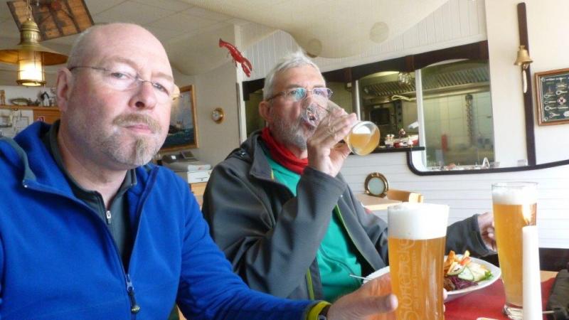Vom Campingplatz ging es dann um 11:30 Uhr über Gahlkow, Vierow, Seebad Lubmin, Freest, Kröslin nach Wolgast. Während die Kumpels eine Bratwurst aßen, holte ich mir in der Apotheke Bepanthol gegen raue Lippen und andere wunde Stellen. Karl-Josef gab die überflüssigen Sachen bei der Post in Richtung Ellen auf. Jürgen und ich suchten einen Fahrradhändler zwecks Kaufs eines Außenspiegels für mein Fahrrad. Bei dem Gewicht ist es nämlich fast unmöglich, sich umzudrehen ohne das Rad zur Seite zu reißen. Jürgen fand auch schnell einen älteren Herrn, der uns mit seinem Rad den Weg außerhalb des Stadtzentrums zeigen wollte. Im Gewühl folgte ich aber nach einiger Zeit versehentlich einem anderen, sehr ähnlich aussehenden und sehr eiligen Radfahrer, und wunderte mich schon sehr, als er nach ca. 2 km plötzlich auf ein Firmengelände ohne Drosselung der Geschwindigkeit - nur mit Handgruß – abbog. Ich dachte aber im Moment: Im Osten ist nichts unmöglich und folgte ihm willig. Securityleute grüßten dann aber irgendwann, fragten höflich: Wohin des Weges? Sie erklärten mir nach einer Weile auch den Weg zum Fahrradhändler, wo ich Jürgen traf! Der Außenspiegel erwies sich wirklich als große Hilfe! Dank an Jürgen! Mittags ging es um 14:15 Uhr zum Essen in den Hafen zu „Fischer Klaus“. Dann fuhren wir weiter über das mondäne Seebad Zinnowitz und über Köpingsee zum Seebad Ückeritz, wo wir um ca. 20:00 Uhr unsere Zelte aufstellten. Der Zeltplatz hat eine Ausdehnung von 4 km mitten im Wald und wir haben ein sehr komfortables großes Waschhaus für uns fast ganz alleine. Wir schafften heute nur ca. 55 km. Jürgen hatte noch eine Reifenpanne. Erst nach längerem Suchen kamen wir zum Ergebnis, dass es wohl am Ventil liegen müsse. Die letzten 3 km durch Wald nahe der Ostsee bis zum Campingplatz hatten es noch in sich. Wir hatten bis 16 % Steigungen zu überwinden. Jetzt gute Nacht! Aber nein: es ist 24:00 Uhr und wir möchten Klaus unsere ganz herzlichen Glückwünsche zum Geburtstag senden! Ganz viel Glück und Segen auf Deinen weiteren Wegen! Alles Gute! Lieber Klaus! Von Heiner, Jürgen und Karl-Josef!