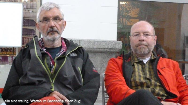 Der Kauf der Bahntickets war schwierig, da die Ticketverkäuferin kein Deutsch und kaum Englisch sprach. Aber nach etlichen Sondierungen hatten wir eine Verbindung, allerdings mit einigen Umstiegen! Der Zug startet um 13:46 Uhr, aber damit wird Karl-Josef am nächsten Tag um 6:14 Uhr in Köln sein. Nach stundenlanger Wartezeit helfen wir Karl-Josef mit Fahrrad und Gepäck (es gab natürlich keinen Fahrstuhl) aus dem Wartesaal auf die andere Seite zum Abfahrtsgleis, das durch einen Tunnel verbunden ist. Wer kennt nicht diese verdammte Schlepperei mit einem bepackten Fahrrad Treppe rauf und runter. In letzter Sekunde findet Karl-Josef noch im abfahrtbereiten Zug den Cyclos-Reiseführer für das Baltikum und reicht ihn mir raus, bevor die Türen schließen und der Zug losfährt.