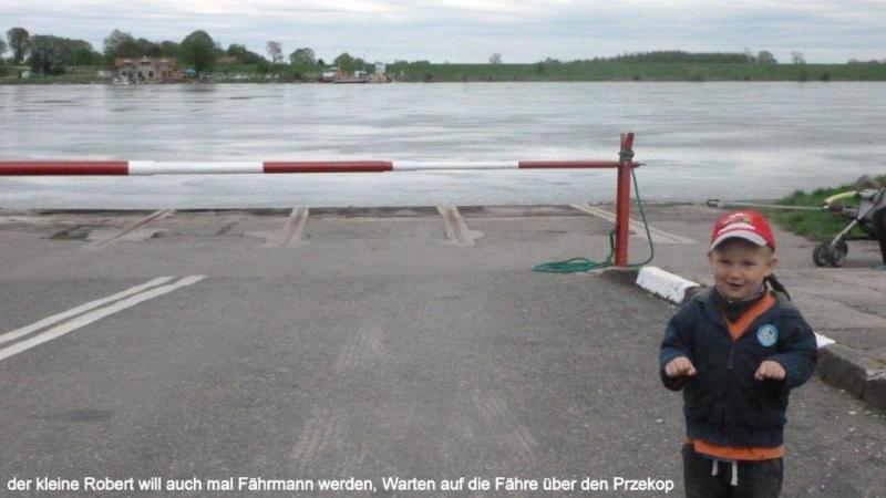 Nach 2 Tagen Pause machte das Fahren wieder so richtig Spaß und nach einer Strecke von ca. 20 km finden wir in Sobieszewo ein einladendes Restaurant mit dem Namen „Tawerna Delfin“. Der Gastwirt empfängt uns bereits am Gartentor auf Deutsch und fragt nach unseren Wünschen. Das Essen war wirklich exquisit und Heiner meint, dies sei das beste Restaurant bisher. Auch die Inneneinrichtung mit einem großen Kamin war sehr ansprechend. Ich machte noch ein Foto mit der ganzen Familie und dann ging es weiter bis unser Weg an dem Fluss Prezekop abrupt endete. Wir sahen aber eine Fähre auf der anderen Seite des sicher 1 km breiten Flussdeltas. Ein dreijähriger Junge mit Namen Robert unterhielt uns und wollte auch gerne aufs Foto. In Stegna dem Tor zur „Frischen Nehrung“ fanden wir einen schönen kleinen Campingplatz nahe an der Küste. Die Chefin bot uns einen kleinen Campingwagen an mit der Bemerkung, in der Nacht würde es sicher sehr kalt und vielleicht sogar regnen. Wir nahmen das Angebot gerne an – brauchten wir doch mal kein Zelt auf und ab zu bauen – und konnten schnell noch zum Strand fahren. Dort haben wir uns dann in ein altes Schifferboot gesetzt (siehe Foto!) mit einem kleinen Abendtrunk und unser Tagebuch geschrieben. Aufregung gab es noch nach der Rückkehr auf den Campingplatz, als Heiner vermeintlich sein Handy verloren glaubte. Zum Glück fand es sich aber im Wohnwagen wieder.
