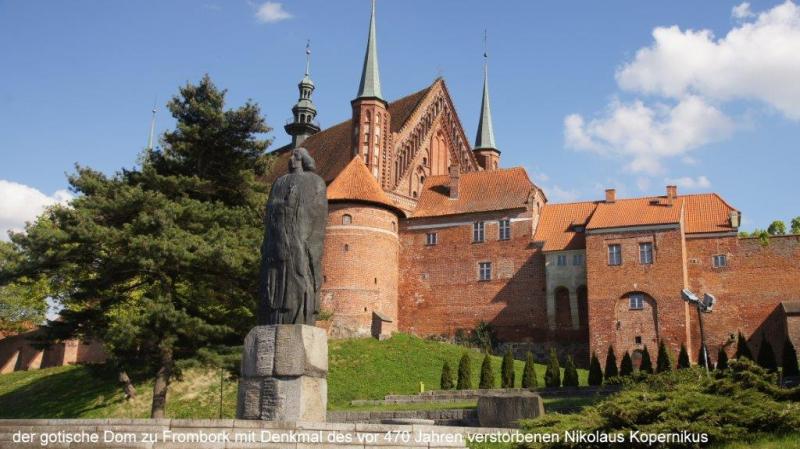 Geschichtliche Anmerkungen Heiner: Frombork liegt im nordwestlichen Teil des Ermlands – Masuren im Kreis Braunsberg (Ostr.). Dort hat vor beinahe 470 Jahre Nikolaus Kopernikus 33 Jahre seines Lebens verbracht und über die „Kreisbewegungen der Himmelskörper“ geschrieben. Gestorben ist er am 21. Mai 1543, er wurde in der gotischen Kathedrale beerdigt, und ist am Montag nächster Woche demnach wie viele Jahre tot? Infolge der ersten Teilung Polens fiel Frauenburg 1772, sowie das gesamte Ermland – wie alle wissen – unter die Herrschaft des preußischen Königs Friedrich II. Den damaligen Status konnten selbst wir nicht durch unseren Besuch wiederherstellen.
