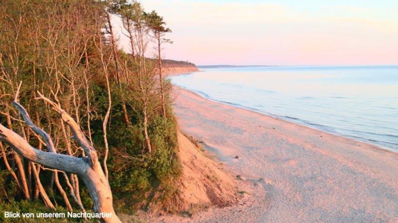 Unter dem Spitzdach standen 11 Betten. Schneewittchen und die 7 Zwerge fehlten. Wir drei verbrachten eine behütete Nacht, natürlich nur in 3 Betten. Also hinkt der Vergleich. Trotzdem waren wir sicherlich genauso glücklich wie Schneewittchen, als sie im Märchen überraschend bei den 7 Zwergen eine Unterkunft fand. Hatten wir doch ein Haus mit Sauna und allem was dazu gehört für uns drei alleine. Unten kochte am Morgen, für uns, die wir nur das Camperleben gewohnt sind, ein Heißwassergerät im Handumdrehen das Wasser für den Nescafé. Genüsslich konnten wir frühstücken, hatten schnell alle sehr schön trockenen Sachen aus Sauna, Wohn- und Schlafzimmer zusammengesucht und gepackt. Jürgen versendete über sein Smartphone die am Vorabend vorbereiteten Mails für den Blog. Wir starten bei 14° C Außentemperatur. Nachdem der Morgennebel sich verzogen hatte, schien jetzt langsam die Sonne und es wurde immer wärmer. Das ließ uns hoffen, nach dem zweiten Regentag unserer gesamten Tour (!!!) wieder eine schöne Strecke in der Sonne fahren zu können. Plan war, nach 30 km in einem am Weg abseits liegenden, vielversprechenden Badeort, Pavilosta, essen zu gehen. Kaum waren wir von der Straße abgebogen, kam uns das Ehepaar entgegen, dass wir in Liepaja an der Fähre getroffen hatten. Sie berichteten von einem verschlafenen Dorf, dass sich wie viele hier an der Küste auf den Saisonbeginn Mitte Juni vorbereitete. Also nach kurzer Überlegung und Checkup unserer Vorräte beschlossen wir an einem „schönen Ort“ ein berühmtes „Jürgensüppchen“ zu essen. Nach 5 km machte mich ein Hinweis mit Zeltsymbol auf eine Wiese 300 m neben der Straße aufmerksam. Unmittelbar über einer Steilküste lud uns ein Wiesengelände mit Bänken und einem Tisch im Blockhausstil zum Verweilen ein. Eine phantastische Aussicht auf die See und ein heißes Süppchen, mit allem, was die Lebensmitteltasche zu bieten hatte, wurde zusammengerührt und ergab mit Brot und Käse ein 10-Punkte-Menü – die Aussicht mit eingerechnet. Im Ort Jûrkalne füllten wir unsere Vorräte für Abendessen und Frühstück des nächsten Tages auf und fanden bald den Zeltplatz Zaki. Ein wunderschöner Naturzeltplatz, auch wie unser Haltepunkt heute Mittag, direkt an der Steilküste. Ein Besitzer war nicht zu finden. Hinweise auf Rufnummer oder Anmeldung fehlten. Wir packten mein völlig nasses Zelt vom vorgestrigen Regen aus. Ein vom Strand kommendes Ehepaar aus Deutschland begrüßte uns freundlich. Sie besaßen ein Haus in der Nähe und kannten den Campingplatzbesitzer und versprachen, ihn zu informieren. Die Sonne hatte nach einer knappen Stunde ihr Werk vollbracht und nicht nur das Zelt getrocknet, sondern sie konnte auch uns durch ihre Wärme erfreuen. Ein anschließender wunderbarer Sonnenuntergang beim Abendessen ließ uns den Regen vergessen. Ein Sonnenuntergang hat immer auch etwas Mystisches und genau diese Frage stellte uns Heiner beim Abendessen, was wir denn unter Mystik verstehen würden. Die Wiedergabe der Diskussion würde unser Tagebuch sprengen und so möchte ich nur mit Fotos vom Sonnenuntergang die Unfassbarkeit eines Geschehens festhalten und euch mit den anschließenden Fotos teilhaben lassen an einem unbeschreiblichen Phänomen.