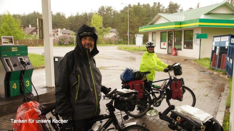 Zurück am Zelt, den Blick gegen den Himmel und zu den Fahnen des Campingplatzes verrieten einen schnellen Wetterwechsel. Mit Wolken und Nord – Ostwind mussten wir uns nun auseinandersetzen. Die Zelte sind nach einem guten Frühstück schnell abgebaut. Um 9:45 Uhr starten wir Richtung Riga. 80 km Tagespensum sind geplant. Ich ahne: zum Rad fahren „ist heute kein Wetter“! So kommt es dann auch. Nach 20 km und einer Stunde auf dem Sattel heißt es Regenkleidung anlegen. Zunächst nieselte es. Dann kam der nicht heftige, aber beständige – typische – Dauerregen in Streifen. Nach weiteren 25 km suchten wir im kleinen Hafenort Mersrags ein Restaurant und wurden in einem etwas abgelegenen Hotel fündig. Das Essen war gut. Die Zeit wurde mit Blogschreiben, Mails absenden (das Restaurant hatte WiFi) für unsere Leser und warten auf besseres Wetter verbracht. Das kam aber nicht. Wie gesagt „es war kein Wetter heute“. Insbesondere nicht für Radfahrer. 60 km im Regen fahren. Was fühlt und denkt man(n)? Anfangs die Frage, ist die richtige Kleidung zur rechten Zeit angelegt? Ja. GoreTex-Socken (habt ihr sicher schon von gehört – wenn nicht, schlagt nach) in Sandalen, um das Wasser wieder herauslaufen zu lassen, halten die Füße trocken und warm. Beinlinge und Radlerhose wärmen den Körper und werden von der absolut wasserdichten Regenhose gegen Außeneinwirkungen geschützt. Am Oberkörper Funktionsunterwäsche, Softshell- und absolut dichte Hardshellkleidung vervollständigen den Regenschutz. Das Wichtigste ist dann noch der Radlerhelm mit einer darunter befindlichen Mütze und ein wasserdichter Überzug. Die Hände sind ein Problem. Handschuhe sind meist nicht wasserdicht und da heißt es immer Finger bewegen und nicht steif werden lassen. Das alles hält den Regen ab! Nun, hört sich gut an – ist es bis zu einem gewissen Grad auch. Nur der Körper erhitzt sich natürlich bei der Fahrt bei leichtem Rückenwind und 20 km/h Geschwindigkeit. Irgendwann hat die Funktionswäsche und Softshellschicht ihre Aufnahmekapazität erreicht und der kühle Fahrtwind von außen die Hardshellschicht und damit alle Isolierschichten überwunden. Schneller treten, nicht stehen bleiben und nicht auskühlen ist angesagt. Nach 60 km stellte Jürgen in der Nähe eines möglichen Campingplatzes mit kleinen Blockhäusern die Frage: weiterfahren oder einkehren? Unter dem Dampf der noch warmen Innenschichten und einer positiven Einschätzung der Leistungsfähigkeit entschied ich mich wie Heiner zum Weiterfahren. Heiner meinte, wir können auch noch bis Riga fahren – nochmal 70 km. Ich protestiere laut. Nun fuhren wir dem am Vortag bei gutem Wetter festgelegten Ziel entgegen. Bei mir sank nach 70 km die Motivation. Die Radfahrbedingungen auf einer immer verkehrsreicher werdenden Küstenstraße mit teilweise tiefen Fahrrillen sind ein eigenes Thema. Erste Versuche, nach 80 km eine Hütte zu finden, schlugen fehl. Es regnete beständig weiter. Dann wurden wir fündig. Verdeckt vom überall vorhandenen Kiefernwald standen Ferienhütten wie sie hier in Lettland sehr häufig anzutreffen sind. Der Sohn der Besitzerin zeigte uns ein Häuschen mit WC, Dusche, Küche und 4 Schlafmöglichkeiten. Wir stimmten zu. Draußen regnete es unentwegt weiter. Mit Hilfe unseres Vermieters wurden Schnüre zum Trocknen unserer Unter- und Oberkleidung in Küche und Dachgeschoss gespannt. Nach dem heißen Duschen gab es Nudeln mit Rindfleisch und wer noch Hunger hatte, aß das wunderbare dunkle lettische Brot mit Kümmel und Salami bzw. Heiner Käse, da in seinem Kauwerk etwas gefährlich wackelt (er verliert wahrscheinlich einen Milchzahn). Der Tag klang trotz allem gut aus. Ich verrate nicht, was wir getrunken haben. Ihr könnt ja mal Mutmaßungen in unseren Blog schreiben. Gute Nacht.