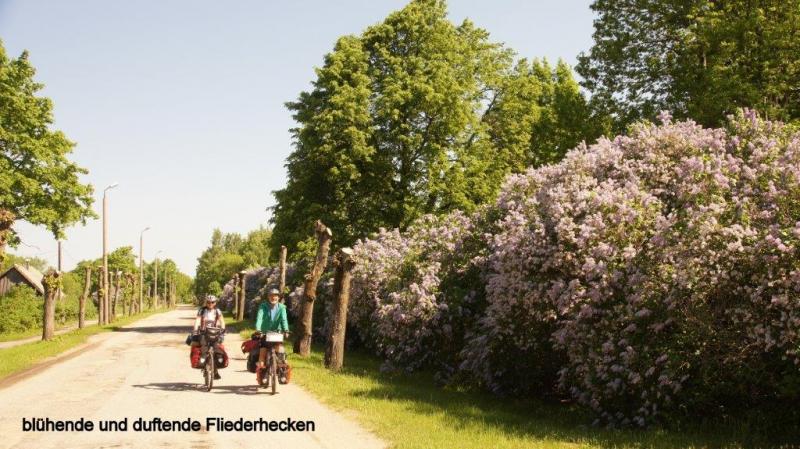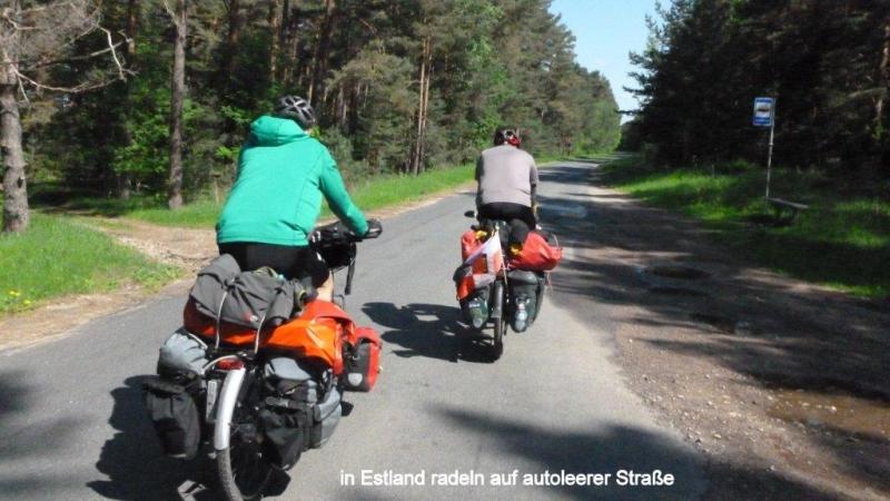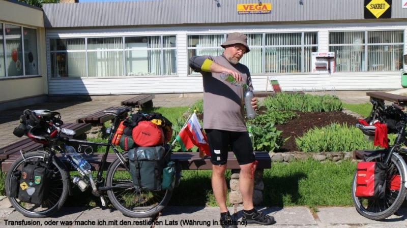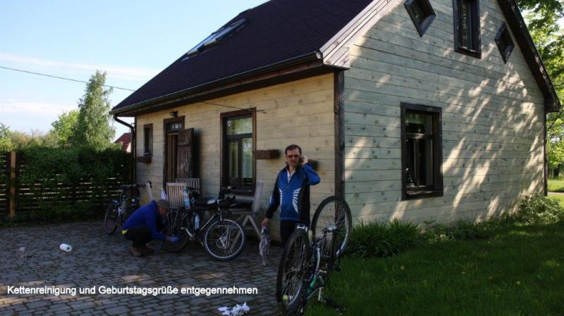 Beim Aufwachen geht der erste Blick zunächst einmal durchs Fenster, um die aktuelle Wetterlage zu ermitteln. Es sieht ganz gut aus. Zum Frühstück wird das letzte Brot verteilt, Käse und Blockwurst gibt es noch genug. Wegen des stinkenden Leitungswassers nehmen wir das gekaufte Wasser aus der Leitung für den Kaffee. Als Heiner aus seinem Separee auftaucht, singen wir ihm erst einmal aus voller Brust ein Geburtstagsständchen. Der Frühstückstisch ist mit Kerzen geschmückt und der dampfende Kaffee wartet schon. Auch mein Smartphone liegt an Heiners Platz, um ihm die schon vielen eingetroffenen Geburtstagswünsche (als Kommentare auf unserem Blog) zu zeigen. Auch erste Anrufe kommen und begleiten das Frühstück. Nach den letzten Regentagen brauchen unsere Fahrradketten mal eine Pflege. Erst Fettlöser mit Rückfettung und dann das gute Rohloffkettenfett wieder drauf und es fährt sich danach wie geschmiert. Trotz der Geburtstagsumstände und der Pflegeaktion für die Räder sind wir kurz vor 10:00 Uhr abfahrtbereit. Zunächst geht es weiter auf der Via Baltica, der Transitstrecke zwischen Riga und Tallinn. Aber heute Morgen scheint die Sonne und so fährt es sich deutlich sicherer. Auch heute kommen uns 2 einzeln fahrende Reiseradler entgegen, man grüßt freundlich. Schon vor der Grenze biegt eine Straße in Richtung Küste ab und wir fahren entschieden stressfreier parallel zur A1. Bis zur Grenze sind es nur noch 13 km und wir nutzen eine Einkaufmöglichkeit, um unsere letzten Lats, die lettische Währung auszugeben. Um allen Befürchtungen zu begegnen, wir gewöhnen uns nicht an den Wodka, sondern müssen nur vorbeugen, da ab Finnland der Alkoholgenuss unerschwinglich wird. Gegen Mittag setzt ein kurzer Nieselregen ein, den wir nutzen, um in dem Ort Häädermeeste zu Mittag zu essen. Das Essen war fastfoodmäßig aber das Bier eine Katastrophe, das nur mit Hilfe einer Zitronenlimo annähernd erträglich wurde. Der Nieselschauer war dann aber zu Ende und so ging es noch etliche Kilometer auf separater Straße weiter. Als wir Nachmittags anhalten, um den Geburtstagskuchen zu essen, erschrecken wir, da sich hinter uns schwarze Wolken auftürmen. So bleibt die Pause nur kurz und wir schwingen uns wieder auf die Drahtesel um die Pedale in Rotation zu bringen. Leider müssen wir wieder über die A1, aber zunächst bleibt es trocken. Die Gewitterfront kommt dann auch von der Seite bedrohlich auf uns zu und wir legen noch einen Zahn zu. Zwischendurch kurze Abstimmung, ob wir weiterfahren sollen oder doch in dem Ort Uulu eine Unterkunft suchen sollen. Es sind noch rund 18 km bis in die Stadt Pärnu. Wir beschließen weiterzufahren, haben aber kurz danach eine verregnete Straße, die Autos ziehen den Regenschleier hinter sich her. Das Gewitter grummelt und wir erschrecken durch Blitze, die neben und hinter uns aufleuchten. Aber welch ein Wunder, es kommt kein Regen. Der Regenschauer ist uns wohl vorausgegangen. Aber wie lange hält es uns noch trocken? Das Gewitter treibt uns mit starken Böen immer weiter auf Pärnu zu. Kurz vor der Stadt geht eine ausgewiesene Fahrradroute ab. Mit 25 – 30 km/h jagen wir durch den Stadtgürtel bis wir ein Schild sehen mit einem Bett, was wir als Unterkunftsmöglichkeit deuten. Aber wir kommen in eine Hochhaussiedlung ohne weiteren Hinweis. Wir fragen Passanten und werden auf ein ca. 4 km entferntes Hotel verwiesen. Es wird immer dunkler und es fängt nun langsam auch an zu (zum Glück nur) tröpfeln. Wieder geht es in Höllentempo weiter, bis eine Straßenbaustelle uns zwingt langsamer zu fahren. Karl-Josefs Navi führt uns aber durch verwinkelte Straßenzüge durch die verschiedenen Baustellen, bis wir vor einem Hostel stehen. Es fängt stärker an zu regnen. Ich gehe mit Heiner ins Hostel zur Rezeption, frage ob noch ein Zimmer mit 3 Betten frei ist und was es kostet. Da die Frau an der Rezeption nur schlecht Englisch spricht, bietet sie ein Zimmer zu 52 € an. Dann meint sie, dass es noch 3 x 13 € gibt, was ich zunächst so interpretiere, dass somit noch 39 € drauf kommen. Das wäre die teuerste Übernachtung unserer bisherigen Reise. Zum Glück klärt es sich dann so auf, dass das Zimmer zu 39 € nur eine Alternative war, so dass wir natürlich sofort einwilligen. Die Fahrräder können wir unten im Treppenhaus abstellen. Als wir unser Zimmer bezogen haben und das Fenster öffnen, strömt der Regen nur so runter. Wir sitzen in einem schönen trockenen Zimmer und Heiner kocht uns aus unseren Vorräten ein leckeres Abendmahl. Nach dem Duschen machen wir uns noch auf, da Heiner uns noch zu einem Bier auf seinen Geburtstag eingeladen hat. Um 10:00 Uhr meint die Bedienung, dass das Lokal schließt und wir leider nichts mehr bestellen können. Glück für Heiner, sonst wären es noch einige Bier mehr geworden. Insgesamt ein spannender aber auch sehr glücklicher Tag.