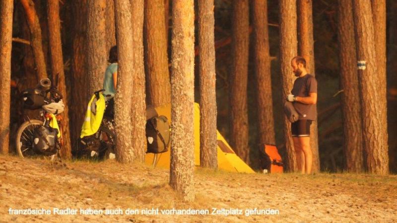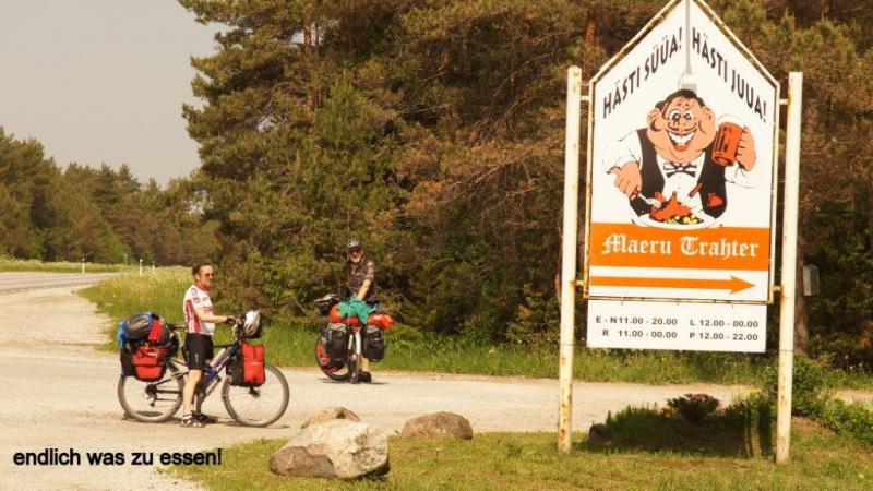 Wir wachen heute bei strahlend blauem Himmel auf. Die Sonne braucht aber noch rund 1 Stunde, bis sie um die hohen Bäume herum gewandert ist und beginnen kann die Zelte zu trocknen. Auch heute Morgen gibt es wieder Probleme mit unserem Coleman Kocher. Ich komme einfach nicht dahinter, was die Ursache sein könnte. Wir haben ja zwei mit. Einen, den ich seit Jahren in Betreib habe und einen Neuen, den wir extra für die Tour noch gekauft haben. Beide haben die gleichen Probleme. Erst dachte ich das falsche Benzin (95 Oktan) gekauft zu haben und dann vermutete ich die kühlen Temperaturen seien die Ursache. Mittlerweile haben wir 98 Oktan und Temperaturen zwischen 18 und 25° und die Dinger wollen immer noch nicht. Warum erzähle ich das? Weil wir morgens immer tierisch lange auf heißes Wasser für unseren Kaffee warten müssen. Aber auch heute gibt es wieder Joghurt, Käse im Überfluss und frische Butter. Die Margarine, die wir noch aus Lettland in einer Dose mitschleppen, ist mittlerweile 4-6 mal während unserer Fahrten aufgeschmolzen worden und die Reste werden entsorgt. Nur die Brotscheiben sind ein bisschen knapp. Aber alle haben genug. Was wir heute am Sonntag vermissen, sind die sonntäglichen Frühstückseier und das, obwohl in unmittelbarer Nähe eine ganze Schar Hühner herumstreunen. Aber von der Familie der Campingplatzbesitzerin schlafen noch alle und selber Eier suchen, trauen wir uns nicht, zumal ein Husky (angeleint) hier Wache hält! In der Blockhütte mit Sauna nutzen wir die Toilette und Wasser können wir aus der Dusche entnehmen. Das Wasser ist erstaunlich frisch und riecht vollkommen in Ordnung, was wir schon lange nicht mehr hatten, daher füllen wir etliche Flaschen auf, zumal der Tag vermutlich sehr heiß werden wird. Im Vergleich zu gestern ist der weitere Weg klar und wir radeln munter drauf los. Nach etwa 9 km hören wir von Heiner erst nervöses Gemurmel und dann ein lautes „Mist“ (es kann auch die verschärfte Form gewesen sein). Was war passiert? Heiner war eingefallen, dass er noch eine recht teure Jacke auf einer Wäscheleine auf unserem letzten Zeltplatz hängen hatte, mit noch einigen anderen Teilen. Er entschied, ich fahre zurück und hole diese. Beiläufig merkte Karl-Josef an, auch noch weiße Socken auf der Leine hängen zu haben, ob er diese ihm mitbringen könnte, was er dann natürlich auch tat. Da wir an einem x-beliebigen Straßenverlauf standen, versprachen wir an der nächsten Bushaltestelle mit Bank zu warten. Wir fahren noch etliche Kilometer, da die Bushaltestellen jeweils da sind, wo es auch Häuser / Weiler gibt und die sind hier manchmal 5 – 6 Kilometer auseinander. Ein nahe gelegener großer Teich bietet während der Wartezeit Gelegenheit mit dem Tele auf Fotosafari zu gehen. Schwirrende Libellen finden allerdings zu selten Zeit, sich mal auf einen Halm zu setzen und dann gibt es noch ein ärgerliches Insekt, dass eine Mischung aus großer Fliege und unserer gefürchteten Bremse ist. Lässt man zu, dass es sich bequem auf eine Hautstelle setzen kann, beißt es zu, aber ohne lästige Nachwirkungen, wie es bei Bremsen- oder Mückenstichen ist. Diese Viecher begleiten uns auch kilometerlang während des Radelns, stehen aber merkwürdigerweise mehr auf unsere Taschen, wo sie sich dann bequem niederlassen und einfach ein Stück begleiten. Man erschrickt nur immer, wenn sie geräuschvoll kreuz und quer an einem vorbei brummen. Die gestern von Jaanus angesprochenen Elche, die nach seiner Schilderung gar nicht so selten Straßen kreuzen und die man durchaus dann zu Gesicht bekommen kann, bleiben uns leider verborgen. Dies wäre natürlich schon ein besonderes Erlebnis für uns. Es geht immer weiter auf einsamen Landstraßen und dann kommen wir plötzlich an eine 5 km lange Straßenbaustelle (steht auf einem Bauschild, mit dem Hinweis der finanziellen Unterstützung durch die EU!). Eine installierte Ampelschaltung ignorieren wir einfach und fahren an der Warteschlange vorbei, da eine Ampelphase für Autos nicht korrespondiert mit der Zeit, die wir mit dem Fahrrad brauchen. Die überholenden Autos fahren wirklich rücksichtsvoll an uns vorbei, aber es gibt auch einige, die durch die sandige, holprige, unbefestigte und lehmige Baustelle mit Karacho fahren und uns kräftig einstauben. Irgendwann ist die Baustelle zu Ende. Wir fahren durch 2 Orte, die in der Karte als größere Orte gekennzeichnet sind. Noch am Anfang der Baustelle war in einem ehemaligen Kloster ein “wie sät me op Kölsch: verdammt füürnehmes Restaurant“ und es kamen ja noch die zwei größeren Orte. Der erste Ort entpuppte sich irgendwie als Garnisonsstandort und der zweite Ort als reine Schlafstätte. Wir fanden weder eine Einkaufsmöglichkeit noch irgendetwas, wo wir was zu essen hätten kaufen können. Wir waren mittlerweile ja schon über 60 km gefahren und bei unserem armen Heiner waren es bereits an die 80 km und wir hatten einen richtigen Hungerast, den auch ein Notproviant bestehend aus Bountyriegeln nicht verhindern konnte. Der Gipfel der Verzweiflung war, als wir einen jüngeren Passanten (die sprechen in Estland eigentlich sehr gut Englisch) nach einem Restaurant frugen. Dieser meinte, das einzige Restaurant sei in westlicher Richtung in etwa 6 km zu finden. Wir fielen fast in Ohnmacht, er meinte genau das “füürnehme Restaurant“ am Anfang der Baustelle. Glücklicherweise war in der Seitenstraße im Ort 2 ein Ehepaar einen Holzzaun am streichen (s.o. es war Sonntag) und dem Mann fiel plötzlich ein (nachdem er zunächst auch auf das westliche Restaurant verwiesen hatte), dass in etwa 8 km in Fahrtrichtung noch eines sei. Er sprach zwar kein Deutsch und kein Englisch, dafür umso umschweifender Estnisch, aber dennoch wurde uns durch Gebärden klar, dass unser Überleben wohl gerettet war. Genauso kam es dann auch und wir hatten eine gute und reichliche Mahlzeit, die wieder wie in letzter Zeit häufiger durch eine Soljanka eingeleitet wurde. Nach dieser