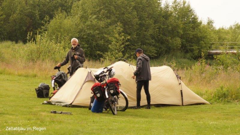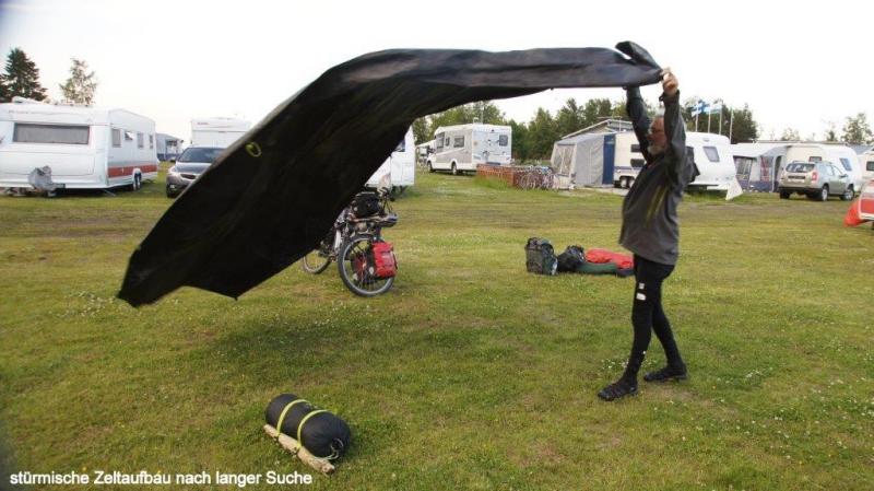 Heiner muss wohl erst gegen 3:30 Uhr in den Schlafsack gekrochen sein. Er hatte sich mit den Campingnachbarn über Norwegen, Land und Leute, sowie deutsche Autos, die hier gerne gefahren werden, unterhalten. Als ich um 8:00 Uhr die Nase aus dem Zelt streckte, galt mein erster Blick dem Himmel. Es war ungewohnt finster. Eine dichte, tiefgraue Wolkendecke hatte dem fröhlichen Treiben und der herrlichen Sonne des Vortages ein Ende gesetzt. Aufmunternd war ein großartiges Frühstück in der komfortablen Platzküche. Lachs, gekochte Eier, Salami und Käse auf einem schmackhaften Körnerbrot mit Müsli und viel Kaffee besänftigten uns zunächst. Das bisher trockene Zelt erhielt die ersten Regentropfen. In den Radtaschen war bereits alles abfahrbereit eingepackt. Donner und intensiver Regen unterbrachen unsere Aktivität und wir flüchteten ins Zelt. Die unfreiwillige Pause dauerte bis 12:00 Uhr. Es war warm aber – es regnete nicht mehr. Die ersten blauen Lichtblicke waren zu sehen und so verpackten wir das nasse Zelt und fuhren zügig zur Nationalstraße 8. Nochmal prüften wir, ob die längere Nebenstrecke und damit Radroute zum Weiterkommen geeignet ist oder der direkte und damit kürzere Weg die Straße „8“ heute besser erscheint. Es war Samstag nach Johannistag – Mittsommernacht und damit für die Finnen Feiertag. Daher ist nicht mit LKW-Verkehr zu rechnen. Der Wind hatte die Straße trocken gefegt und so hofften wir, schnell über die „8“ ohne nass zu werden an unser 60 km entferntes Ziel zu kommen. Über unseren Köpfen trieben Wind, Sonne und Wolken ihr Spiel. Nach einiger Zeit war im Rückspiegel, also im Süden, blauer Himmel zu sehen. Vor uns schwarze Wolken. Der Wind war sehr böig und drückte mich seitlich fast in den Straßengraben. Es war nicht einfach das schwere Rad auf dem schmalen Randstreifen zu halten. Neben der Fahrbahn befindet sich ein durchgehender weißer Streifen. Daneben knapp ein Meter Platz für uns. Die Fahrzeuge rasen vorüber und halten meist Abstand. Wir fahren im Windschatten. Ich einen halben Meter hinter Jürgen dann Heiner. Der Himmel zieht sich immer mehr vor uns zu und wir machen mit den ersten Regentropfen Mittag an einer Tankstelle mit Pizzarestauration. Das Schnellrestaurant lieferte nach einer Stunde Wartezeit die bestellten Pizzas an den Tisch. Wir hatten es nicht eilig, da draußen der erwartete Regen niederging. Auf der Weiterfahrt trieben Wolken und Wind ihr Spiel ohne dass es regnete. Außerhalb der Ortschaft hatte sich nun der Wind gedreht und wehte nun sehr böig von Nord-Westen. Aber nun vor uns ein blauer Streifen der immer größer wurde und immer näher kam wie wir ihm entgegeneilten. Das Wolkenband wich zurück, irgendwann stand es über unseren Köpfen, nur vor uns blauer Himmel und Sonne. Die Wolken zogen sich zurück, die Sonne wärmte meine verschwitzte Kleidung. Wir waren trocken davon gekommen. In Raahe angekommen begann das Suchen. Auf der 600.000-Karte war ein Zeltplatz eingezeichnet. „Den gibt es nicht mehr“ sagte ein Passant. Ein nächster wurde gefragt. Erst ein Tourist mit Stadtplan lieferte den ersten Beweis für die Existenz eines Campinglatzes. Wir fuhren in die vermutete Richtung. Eine Walkerin gab dann den richtigen Hinweis: „Ja, es gibt einen neuen Campingplatz Ortsteil Mikonkarin“. Ich hatte dann auch den Ort im Navi ausfindig gemacht. Nach 5 km erreichten wir einen sehr großen Platz voller Wohnmobile und Wohnwagen und neuen modernen Häusern. Am Rand campte ein Hamburger, der mit dem Fahrrad aus Schweden kam und die Ostsee links herum umradelte. Er habe bis hier 7 Wochen benötigt, berichtete er. Natürlich erfolgte ein Austausch über das Erlebte, Wege oder Radprobleme bzw. neue Ziele. Nach dem reichlichen Abendessen rutschten wir müde in den Schlafsack. Die vergangene Nacht war ja kurz gewesen.