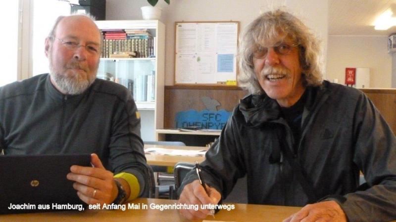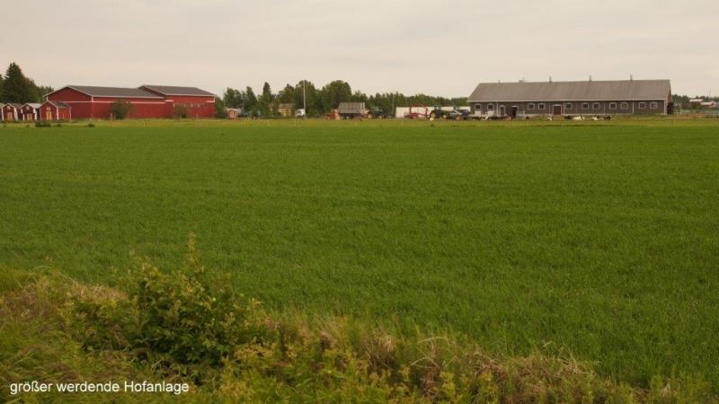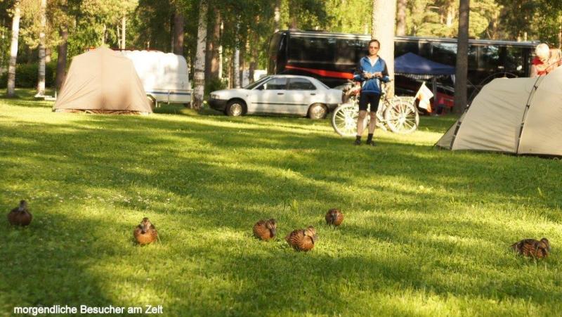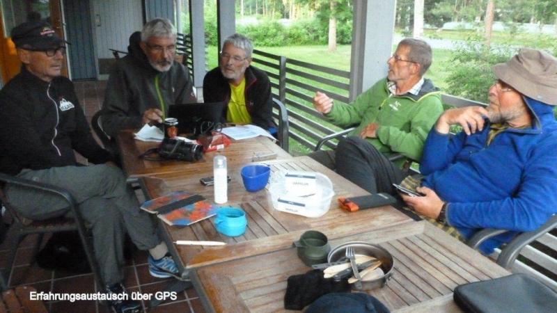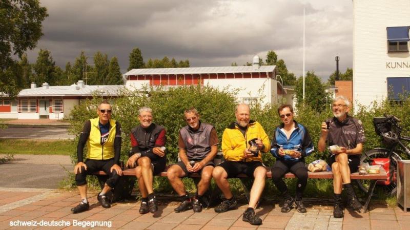 Das Wetter ist trübe und es fängt an zu nieseln. Wir sitzen nach dem Frühstück noch mit Joachim, gerade pensionierter Städteplaner und Architekt aus Heist bei Hamburg, zusammen und erzählen aus der schon zurückgelegten entgegengesetzten Strecke; er aus Schweden kommend und wir aus Finnland. Wieder unterwegs, lacht die Sonne wieder und wir sehen nach einer Weile bekannte Gestalten: nämlich Sepp, Werni und Eddi aus der Schweiz hinter uns. Der Alpenexpress kam unaufhörlich hinter uns her und sie setzten dann zum Überholvorgang an. Sie hatten in einer Kleinstadt vor unserem Nachtquartier genächtigt und waren nun schon 27 km länger unterwegs. Sie überholten uns auf ihren schnellen Rädern (8 kg) und leichtem Gepäck (nur 12 kg). In Siikajoki sahen wir uns dann beim Mittagessen wieder. Wir holten uns im Supermarkt ebenfalls leckere Fertiggerichte mit viel Salat und machten auf der Bank eine letztes gemeinsames Foto, denn sie beabsichtigen, einige Tage in Oulu zu bleiben um dann weiter zum Nordkap zu pedalieren. In Honningsvåg wollen sie sich mit ihren Frauen treffen, die von Kirkenes mit dem Postschiff auf der Hurtigrute kommen werden um dann mit dem Schiff gemeinsam nach Bergen zu fahren, um von dort zurück zu fliegen. Bei schönstem Wetter kommen wir auf dem bewaldeten Campingplatz in Oulu an und können uns noch auf die Terrasse zum Abendessen setzen. Es ist ein richtiges Sonntagessen, das ich mit Jürgen zubereite. Es gibt zwei Dosen Bier und zum Nachtisch von Jürgen spendiert reichlich Vanilleeis mit Erdbeeren. Als wir gerade fertig sind kommen die Schweizer, denen wir nur noch ein Stück vom Schokoladenkuchen anbieten können. Karl-Josef erklärt Sepp und Werni das Garmin Map GPS 62a. Wir verabschieden uns irgendwann am späten Abend endgültig von drei sehr humorvollen und ausgesprochen sympathischen „jungen“ Männern, nicht ohne die Adressen ausgetauscht zu haben.