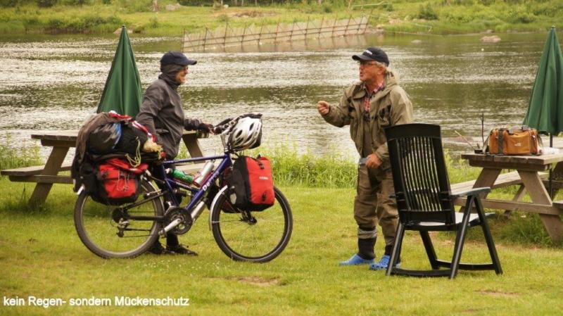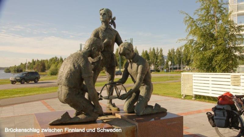 Das Wasser der Dusche ist kochend heiß. Ich muss aufpassen, dass ich mir nicht die Finger am offen verlegten Zuleitungsrohr der Heißwasserleitung verbrenne. Das heiße Wasser ist in allen Campingplätzen in Finnland mindestens 80 Grad heiß. Daher gehe ich überall sehr vorsichtig mit der Mischung kalt-heiß um. In dem sehr einfachen Platz sind die Sanitäranlagen in teilweise primitiven Holzhütten untergebracht. Es reicht um sich frisch zu machen und in der Küche Wasser zu kochen und einigermaßen „mückenfrei“ zu frühstücken. Wichtig ist immer, genügend Frischwasser mitzunehmen. Das ist nur an einem Wasserhahn auf dem Platz möglich. Da der Campingplatz unmittelbar an der Fernstraße 4 liegt, sind wir schnell auf der Strecke und können von dieser verkehrsreichen Straße bald auf gut ausgebaute Fahrradwege und unmittelbar daneben führenden Nebenstraßen Richtung der Stadt Kemi fahren. Hier essen wir nicht nur hervorragend und günstig in einem vietnamesischen Restaurant mit Buffet, sondern wir finden, nach sehr freundlichen Hinweisen, ein gut sortiertes Fahrradgeschäft. Hier erhält Heiner endlich den langersehnten passenden Vorderradmantel für sein in der Stadt Raahe erworbenes neues Vorderrad. Unbeschwert fahren wir der finnisch-schwedischen Grenzstadt Torneo entgegen. Dort verläuft im Fluss Torneälven die Grenze. Der teilt sich so vor der Mündung in die Ostsee auf, dass Torneo auf einer Insel liegt. In der Stadt Haparana auf der schwedischen Flussseite fällt der sehr moderne neue Grenzbereich ins Auge. Beim Blick weiter nach Schweden ist unverkennbar die „Ikeasäule“ mit neuen Einkaufsmärkten zu erkennen. Auf Jürgens Karte und meinem Navi ist sowohl im finnischen Torneo wie auch auf der anderen Flussseite in der schwedischen Grenzstadt Haparanda ein Campingplatz auszumachen. Wir entschieden uns für Haparanda, da wir in Schweden dann gleich Kronen im Geldautomaten ziehen können und in der Stadt nach einer besseren Straßenkarte mit Campingplätzen Ausschau halten können. An zwei Banken ist der Geldautomat außer Betrieb. Die Suche nach dem Campingplatz scheint einfach, da er auf dem Navi wie auch auf der Karte etwas flussabwärts eingezeichnet ist und ab Ortsmitte sogar Hinweisschilder zu sehen sind. Jedoch weit gefehlt. Auf dem vermeintlichen Campingplatz stehen mehrere neue 5-stöckige Blocks, die nicht bewohnt scheinen. Wir fragen Passanten und erhalten die Antwort, dass vor einem Jahr die Campinganlage abgebrannt sei. Kurz entschlossen übernachten wir auf einem frisch gemähten Wiesenstreifen, der nicht zu einem benachbarten Grundstück mit alten Booten und Wohnwagen gehört. Die freundlichen Passanten ermunterten uns dort zu übernachten, da dies eine öffentliche Wiese ist und freies Campen erlaubt sei. Entschieden – getan; aber die Mückenplage bereitet uns, trotz Sonne und Flusslandschaft im Hintergrund, keine Freude. Vorräte fürs Abendessen sind genug vorhanden. Heiner zieht sich schnell ins Zelt zurück und Jürgen und ich fangen die Umgebung mit Fotos bzw. Videos ein. Die wenigen Male, die wir bisher „wild“ gecampt haben, schlief ich immer sehr unruhig. Diesmal nicht. Kaum im Schlafsack war ich im Land der Träume.