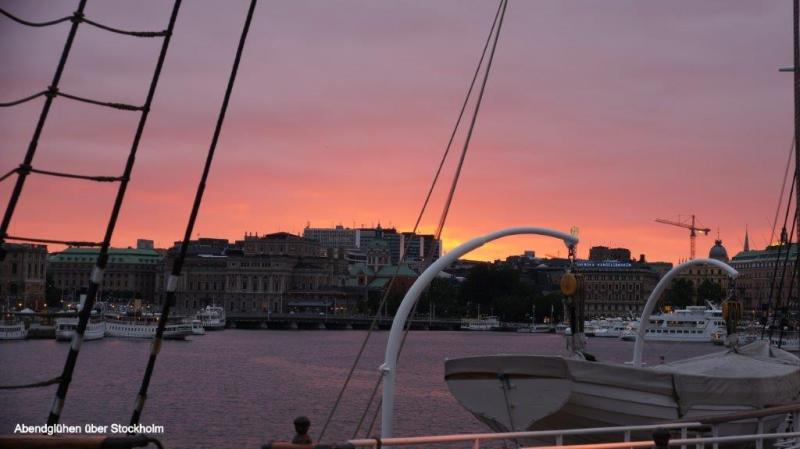 6:30 geht Karl-Josef duschen. Ich bleibe noch bis 7:00 Uhr liegen und mache mir bewusst, dass heute Sonntag ist. Heute gibt es für die Jungs deshalb auch zwei Spiegeleier. Es zieht sich zu und wir beeilen uns, die Zelte ins Trockene zu bekommen. 9:30 Uhr fahren wir dann los und ich wundere mich sehr, wie dieser Campingplatz mit den geringen Kapazitäten und ohne Kühlschrank 4 Sterne bekommen konnte. Es ist kaum Verkehr und wir können die sehr ansprechende Innenstadt in Ruhe genießen. Alles beherrschend steht der mächtige Dom zu Uppsala im Zentrum der Stadt. Mit einer Länge von 118,7 m, einer Turmhöhe von 118,7 m und einer Deckenhöhe von 27 m ist der Dom die größte Kirche der nordischen Länder. Seine Bauzeit dauerte von 1270 bis 1435. Jahrhundertelang wurden hier die schwedischen Könige gekrönt. Wegen der Reliquien Eric des Heiligen ist sie zugleich Wallfahrtskirche. Die Kirche strahlt im Inneren sehr viel Wärme aus. Als wir weiterfahren fängt es an zu regnen, was bis 12:00 Uhr anhält. Die beiden Kameraden beschließen um 13:00 Uhr eine Gaststätte aufzusuchen, um die nasse Kleidung zu wechseln. Wir landen in einem ansprechenden Westernsalon ganz aus Holz und sind mit dem Essen zufrieden. Allerdings gibts keine Westernmusik, sondern nicht so angenehme Rapmusik. Dann gehts weiter bei schönstem Wetter in die City Stockholm. Erst mal müssen wir uns allerdings durch die Vororte quälen. Überall Baustellen, wo auch noch am Sonntag gearbeitet wird. Dann werden wir aber durch die überwältigende Innenstadt entschädigt. 17:30 Uhr Ankunft an dem majestätischen Dreimaster, der Af Chapman, die Jürgen vorab gebucht hat, weil er dort schon vor 18 Jahren war. Dort wollen wir drei Mal übernachten. Wir sind schon sehr gespannt, was uns erwartet. Aber die Kajüte mit drei Doppelbetten ist nicht so klein, wie ich befürchtet hatte und hat zwei geöffnete Bullaugen. Wir essen unseren morgens vorbereiteten Proviant am Heck des Schiffes und schauen der STS Berlin beim Ablegen zu. Dann stellen wir fest, dass die Sanitäranlagen viel besser als auf so manchem Campingplatz sind und fühlen uns auf dem Riesensegelschiff schon richtig wohl.