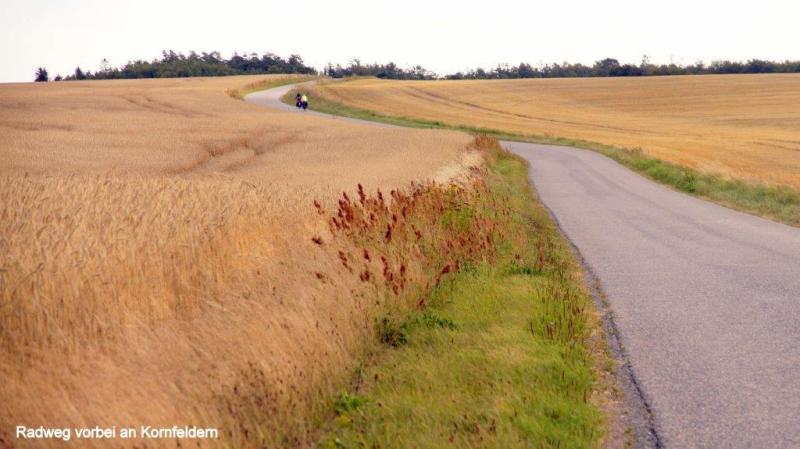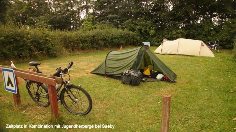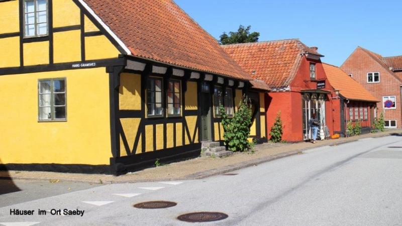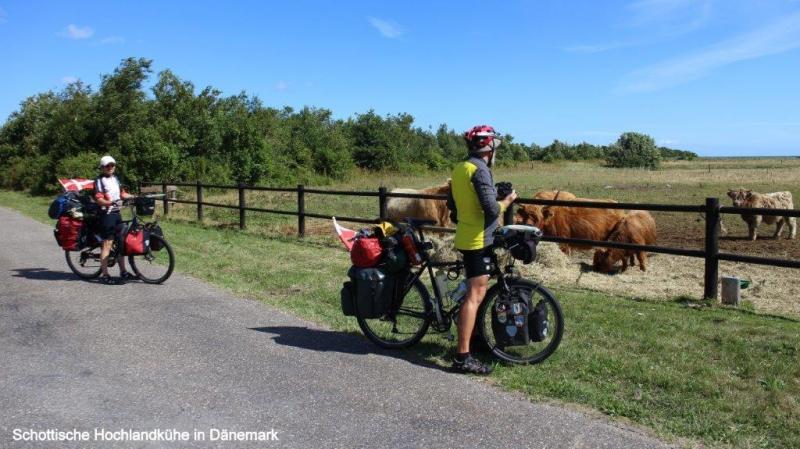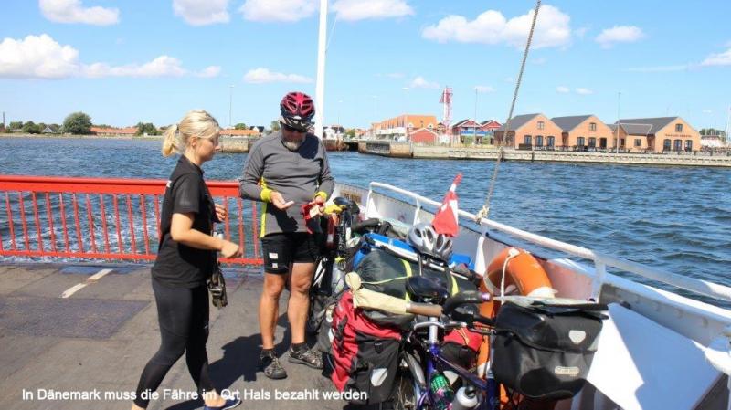 Am Morgen wird immer die Frage gestellt: „ist alles trocken?“. Das wechselhafte Wetter war uns, seitdem wir in Dänemark sind, nicht mehr hilfreich. Diesmal schien die Sonne mit voller Kraft und beim Frühstück beobachten wir die Richtung des Wolkenzuges. Blauer Himmel oder schwarze Regenwolken? Die noch feuchte Sitzgarnitur wurde mit der Zeltmatratze abgedeckt und schon konnte der heiße Kaffee genussreich getrunken und das schon erwähnte Standardfrühstück eingenommen werden. Der Fahrweg gegen Süden war klar. Zunächst durch den nahen Ort Sæby. Liebevoll restaurierte alte Häuser bremsten unseren Start. Natürlich mussten wir unsere Eindrücke mit der Kamera festhalten. Bei dieser Gelegenheit sah Heiner in einem Andenkenladen eine Auswahl kleiner Flaggen vor der Tür stehen. Er griff zunächst zur finnischen Flagge (weißer Grund und blaues Kreuz) und wurde beim Kauf von der netten Verkäuferin auf die von ihm gewünschte Dänemarkflagge (roter Grund und weißes Kreuz) hingewiesen. Die Flagge weht seitdem hinten am Gepäck. Wir folgen dem Radweg „Eurovelo 12 Part Denmark“ über den Ort Hou, in dem wir am Hafen unsere Mittagsbrote essen. Dann mussten wir zur Fähre im Ort Hals, um den Weg bis zur Stadt Aalborg zu sparen und an der Küste zu bleiben. So bleiben wir auch bis Øster Hurup dem Küstenradweg treu, müssen aber dann den Weg zur 12 km landeinwärts liegenden Stadt Hadsund nehmen, da der breite Fjord nicht unmittelbar an der Küste mit einer Fähre überquert werden kann. Jedoch noch mal zurück zur Küste. Sie ist im Vergleich zur schwedischen völlig anders. Meine Beobachtungen beschäftigen sich jedoch nur mit der bereisten nord-westlichen Seite Dänemarks. Im Norden finden wir teilweise hohe Sanddünen. Zirka 5 km landeinwärts erstreckt sich hügliges Gelände mit sehr viel Weidelandschaft, manchmal bis unmittelbar an die Ostsee. Dazwischen immer wieder Badestrände an Ortschaften oder direkt an den sehr teuren, schon beschriebenen Campingplätzen. Nach dem erstmaligen Verlassen der Küste in Øster Hurup geht uns das Auf und Ab der bis zu 100 m hohen Anstiege zum Landesinneren ganz schön in die Beine. Jetzt schon verraten: ganz Dänemark verfügt in seiner Fläche von bis zu 114 m hohen großen oder kleinen Hügeln! Hier sehen wir große Getreidefelder, die bei Sonnenschein einen wunderbaren Duft von trockenem Stroh ausströmen. Wenn der Westwind, der uns schon alle Tage begleitet, uns die über dem Kornfeld liegende Hitze entgegen treibt, spüre ich einen heißen Hauch wohltuender Wärme. Das trocknet die Kleidung und tröstet über Regenzeiten hinweg. Je länger wir heute unterwegs sind, desto stärker verdunkeln immer mehr dichtere Wolken den Himmel und wir sind froh, am späten Nachmittag die Stadt Hadsund anzusteuern. Wir hatten uns für einen Zeltplatz in Kombination mit Jugendherberge bei Sæby entschieden. Hier betreut Maria die Gäste schon seit über 20 Jahren. Sie ist aus der Schweiz und weiß uns mit einigen Empfehlungen für die weitere Strecke zu helfen. Die größte Überraschung aber ist, dass sie für Radler jeweils eine Duschmarke kostenlos zur Verfügung stellt. Sie ist selber begeisterte Radlerin und hat ein Herz für die Mühen (aber auch manche Freuden in der immer nahen Natur), die man als Radler auf sich nimmt. Neben einem erfreulich günstigen Übernachtungspreis noch eine Belohnung zusätzlich, die wir dankend annehmen. In kurzer Entfernung gab es einen Aldimarkt, wo Jürgen noch für kleines Geld (ist hier in Dänemark ansonsten nicht ganz einfach) fürs Abendessen und Frühstück einkaufte. Die Zeit zum Kochen war knapp bemessen, da der Blog noch bearbeitet werden musste. Daher wurden 2 Dosen Gulasch mit Würstchen heiß gemacht und das nun in Dänemark „hochprozentige“ (4,5 %) preiswerte Bier genüsslich getrunken. Heiner schreibt, dick in mehreren Jacken eingepackt und mit einer Stirnlampe ausgerüstet, am Sitzplatz der Wiese noch lange an seinem Tagesbericht. Im Tiefschlaf habe ich sein „Einrücken“ ins Zelt nicht bemerkt.