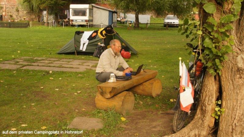 Ich bin schon früh wach und der Erste im Frühstücksraum. Es ist eine Schulklasse hier, die aber glücklicherweise erst später dazu stößt. In der Nacht habe ich erstaunlicherweise nichts von denen gehört! Auch jetzt machen sie einen sehr rücksichtsvollen Eindruck, anders als gestern in Scharbeutz. Packen und Bettabziehen, alles 4 Stockwerke runtertragen und wieder hoch stampfen. Mensch, bin ich froh, gut trainiert zu sein. Ich lade alles aufs Rad und dann suche ich den Elbe-Lübeck-Kanal, der hinter dem Holstentor losgehen soll. Aber ich finde keine Hinweisschilder und außerdem möchte ich ja die St. Jürgen Kirche finden. So etwas gibt es ja im Rheinland nicht und so etwas habe ich auch noch nie gefunden. Über eine breitere Ausfallstraße komme ich schnell in den Stadtteil St. Jürgen. Aber ich muss mich mehrfach durchfragen, bis mir eine nette ältere Dame den Weg erklären kann, der dann gar nicht mehr so weit ist. Umgeben von einem Friedhof ist diese Kapelle in typischem Ostsee-Backsteinziegelbau für ein bis 1847 bestehendes Hospital errichtet worden. Im Inneren, als auch im Äußeren findet sich Georg der Drachentöter, den wir auf unserer Reise in verschiedenen auch politischen Bedeutungen schon gefunden haben. Im Norden wird anstelle des Namens Georg halt Jürgen verwendet und meiner Mutter sei Dank, hat sie mir diesen Namen gegeben. Der Pastor meinte jedoch bei der Taufanmeldung der Georg müsste noch hinzu und Maria als Zusatz wäre dann auch noch zu empfehlen. Daher steht in meiner Geburtsurkunde Jürgen Maria Georg Vosen, wobei nur die ersten beiden verwendet werden! Der schlichte Innenraum lädt zum Verweilen ein und ich habe allen Grund einen stillen Dank für die so schöne und unbeschwerte Reise abzugeben und auch für den Rest meiner langen Fahrt noch um Schutz zu bitten. Danach geht es erst einmal in den Vorstadtverkehr von Lübeck, bis ich dann auf den Elbe-Lübeck-Kanal treffe, dem ich dann immer auf einem begleitenden Kies-Schotterweg rd. 80 km folge. Immer wieder erwische ich mich dabei, dass ich in den Rückspiegel sehe, aber keiner meiner Radelpartner ist hinter mir. Nun könnte ich ein Tempo fahren, wie es mir genehm wäre, aber ich habe mich so in der Trittfrequenz und dem Tempo angepasst, dass ich immer meine Partner hinter mir wüsste. Ich spüre ein komisches Gefühl, es ist nicht die erwartete Unabhängigkeit, die ich auskosten wollte, sondern schon ein wenig ein Gefühl des Verlustes. Es überrascht mich und ich freue mich über wenn auch nur ganz wenige Begegnungen auf meinem Weg. Einer Familie, die an einer Schleuse auf ihrem Motorboot auf die Einfahrt in den Schleusenkanal wartet, während ich vorbei radle, rufe ich zu: „Das wäre mir zu gemütlich!“ Was zu einem netten Dialog führt. In Berkenthin liegt eine Rekonstruktion eines mittelalterlichen Kahns am Ufer. Schon ab dem 14. Jhd. wurde in Lüneburg gesiedetes Salz von Lauenburg mit solchen Kähnen über die Vorläufer des Elbe-Lübeck-Kanals nach Lübeck transportiert. Wie ich so vor mich hin strample, entdecke ich, dass Nacktschnecken immer zielgerichtet exakt im rechten Winkel den Fahrweg queren. Wenn sie wüssten, dass sie dann volle Breitseite bieten und viel gefährdeter sind durch Radfahrer, als wenn sie diagonal queren würden (längs wäre genauso unsinnig). Schei …e, über was denkt man denn so nach, wenn man Stunden alleine fährt? Beim Verlassen des Kanals wird es etwas schwierig nach Lauenburg herein zu finden. Ich treffe jetzt auf viele Reiseradler, die auf der östlichen Seite der Elbe unterwegs sind. Hier sind Ellen, Elisabeth, Karl-Josef und ich im letzten Jahr auch von Hamburg bis Prag gefahren. Ich gehe in die Touristeninformation, hole mir Rat zu einem Campingplatz auf der anderen Seite der Elbe in Hohnstorf und kaufe mir eine Fahrradkarte zur Lüneburger Heide. Im Ort Lauenburg sind noch deutliche Spuren vom Hochwasser aus dem Mai zu erkennen, das wir ja nur beiläufig mitbekommen hatten, da wir ja schon Ende April gestartet sind. Auf der anderen Seite erfahre ich dann, dass der Campingplatz in Hohnstorf ebenfalls komplett hoch unter Wasser gestanden hat. Aber es gibt dann erst eine Ernüchterung, als mir ein Campingbewohner mitteilt, dass der Campingplatz nur noch auf privater Basis benutzt werden kann. Glücklicherweise mache man aber für Radler eine Ausnahme, da diese ja nur immer eine Nacht blieben und die Elberadweg-Führer diesen Platz noch auswiesen. Leider sei der Platzwart aber z.Zt. nicht da und wenn ich einen Schlüssel bräuchte für Toilette und Dusche könne ich ihn geliehen haben. Den Platzwart habe ich auch am nächsten Tag nicht zu Gesicht bekommen, was ich ohne Nutzung der Toilette und Dusche dann auch als kostenlose Übernachtungsmöglichkeit betrachtet habe. Schlimmer war, dass ich auch nirgendwo eine intakte Steckdose fand und damit nicht an Blogs schreiben konnte. Früh am Abend wird alles schnell feucht und klamm und ich verschwinde schon zeitig in meiner liebgewonnenen Hundehütte (wie entwöhne ich mich hiervon nur wieder?).