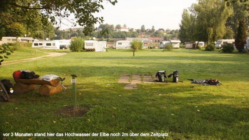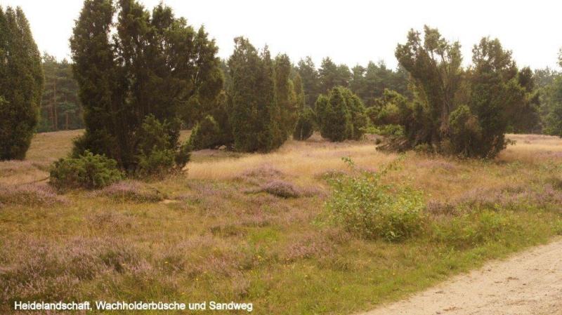 Ich bin früh wach, habe keinen Schlüssel um eine Örtlichkeit aufzusuchen, da ich ja nicht den angebotenen Schlüssel von den Dauercampern einfach über Nacht behalten kann. Also wie beim Wildcampen, es findet sich eine blickdichte Stelle etwas abseits des Camps und ich habe die Natur für mich! Verdammt kalt war es in der Nacht und ich musste mir meinen dünnen Polarfleece –Pullover noch über meinen dünnen Schlafanzug ziehen. Heute Morgen ist wieder Reif auf dem Gras festzustellen, dass hatten wir ja am Anfang unserer Reise auch schon, aber da hatte ich noch meinen warmen Schlafsack dabei. Den hatte ich Karl-Josef bereits mitgegeben, als er von Danzig nach Hause fuhr. Eine nette Stellplatzcamperin ist so nett und macht mir einen kleinen Topf mit heißem Wasser für meinen Frühstückskaffee. Welch ein Wohlbefinden überkommt mich, wenn man so leicht fröstelnd dann einen dampfenden Nescafè mit Kaffeeweißer (Trockenmilch) aus einem Plastikhenkelbecher über die Zunge, durch den Schlund in sich einfließen lassen kann. Die kalten Finger um den heißen Becher geschlossen, ergibt sich auch noch eine zusätzliche Wärmequelle. Das Frühstück, wie schon über 100 Tage zuvor (ausgenommen der Tage mit festen Unterkünften), besteht aus Vollkornbrot, Salami, Käse, Butter, Jogurt mit Müsli. Wir haben uns einen Standard zugelegt, der keine wesentliche Variation zulässt, wenn man in warmen Jahreszeiten unterwegs ist. Zwei Brote werden für den plötzlichen Hunger unterwegs geschmiert. Der Rest des nunmehr nur noch warmen Wassers im Topf dient als Spülwasser für die nur wenigen Teile. Eine weitere spannende Frage beschäftigt mich heute, hält meine Hinterradfelge durch, die ja wie bereits berichtet, einige Schläge abbekommen hat und nun durch Verdickungen an 2 Stellen der Felgenflanken kein dosiertes Bremsen mehr zulässt. Hier in der Heide gibt es keine steilen Abfahrten, daher reicht die Vorderradbremse für das normale Bremsen aus. Von der Elbe geht es nun ein kurzes Stück über einen begleitenden Fahrradweg entlang der B209. Da ich nicht durch die Stadt Lüneburg fahren möchte, suche ich mir Radwege über kleinere Ortschaften aus, die einen Bogen um Lüneburg machen. Hier geht es erst noch schön flach durch die Samtgemeinde Bardowick. Bei schönem Wetter lässt sich über die schmalen, wenig befahrenen Landstraßen gut und ruhig fahren. Eine längere Strecke begleitet mich der Radweg “Lüneburger Heideweg“, der dann auch nach Amelinghausen führt. Hier wird der Weg dann leicht hügelig und die Radwege führen auch schon einmal direkt auf sandigen Wegen durch Heidelandschaften. Jetzt im August stehen die Heideflächen in voller Blüte, die durchsetzt sind mit skurilen Wachholderbüschen. Als Mittagsmöglichkeit habe ich mir auf der Karte das Gut Thansen ausgesucht, das sich romantisch gelegen, dann aber als vornehmes Schulungs- / Konferenzzentrum mit livrierten Kellnern zeigt. Hierauf habe ich keine Lust, zumal dann eine gefühlte Hundertschaft an Schulungsgästen - natürlich ein Jeder mit Handy telefonierend - gerade den Speisesaal in Beschlag nimmt. Nein, dies muss ich jetzt nun wirklich nicht haben, zumal ich einen gemütlichen Landgasthof erwartet habe. Also schwinge ich mich wieder auf meine rollende Drahtheideschnucke und es geht weiter über Sand- und Schotterwege, bis ich nach Steinbeck komme, wo ein Hinweisschild auf eine Gaststätte aufmerksam macht. Hier finde ich ein rustikales ruhiges Lokal und der Wirt holt extra ein Verlängerungskabel, damit ich im Biergarten das Notebook anschließen kann, um mich noch offenen Blogs zu widmen. Das Cordon bleu ist ausgezeichnet und auch alkoholfreies Weizen gibt es (natürlich mit Zitronenscheibe!). Da es heute nicht mehr allzu weit gehen soll, bleibe ich hier gut 1,5 Stunden sitzen und habe am Ende sogar die Möglichkeit Blogs abzuschicken. Danach geht es zum kleinen Heidedorf Bispingen, dass den Mittelpunkt der Lüneburger Heide darstellt. Dies wird deutlich an den reichlichen Souvenirläden und den vielen Besuchern, die Cafés und Lokale bevölkern. Stadtauswärts heißt es kräftig in die Pedale zu treten, da ich zwar nicht über den 169,2m hohen Wilseder Berg muss (die höchste Erhebung der Lüneburger Heide), aber der 115m hohe Münzenberg mich doch auch fordert. Als ich auf die B209, bzw. dann auf die B71 komme, wird deutlich, wieviel besser Radwege entlang von Bundesstraßen sind, im Vergleich zu Kreis- oder Landstraßen, wo Wurzeln den Asphalt hoch drücken und manch unerwartetes Schlagloch auftaucht. Alles nicht gut für meine Felgen und auch nicht für den “Popo“, der den Brooks-Kernledersattel dann heftig zu spüren bekommt. Dieser Sattel hat mich nur selten auf all den vielen Kilometern fühlen lassen, dass es kein Polster gibt. Was die Hinterradfelge betrifft, noch hält sie! Kurz vor Soltau komme ich auf einen preiswerten und fast schon leeren Campinglatz, der nicht nur einen Badesee hat, sondern auch ein Hallenbad, was ich dann am Abend noch aufsuche, da ohnehin Duschen angesagt ist. Eine junge Familie mit zwei kleinen Kindern, 3 ältere Ehepaare mit Wohnmobil, bzw. Wohnwagengespanne sind in einiger Entfernung im zugewiesenen Areal. Etwas entfernter gibt es wohl einen Bereich mit Jahresstellplätzen, aber alles sehr distanziert, wenn ich es richtig einschätze. Mein kleines Zelt sieht etwas verloren aus, auf dem großen Platz. Aber lieber so, als dichtes Gedränge. In Bispingen hatte ich eingekauft, was dazu führt, dass ich jetzt einen Schluck aus der erworbenen Weinflasche genießen kann und dazu die geschmierten “Hasenbrote“ vom Morgen noch esse. Hintendrauf noch einen Becher Früchtemilchreis, der bei warmem Wetter immer gut schmeckt. Mir fällt auf, dass ich die ganze Flasche Wein mit mir selber teilen könnte, aber viel besser würde so eine Köstlichkeit in Gesellschaft schmecken. Wieder spüre ich, dass mir meine Radelpartner fehlen, auch wenn ich bei diesen Genussmenschen immer zusehen musst