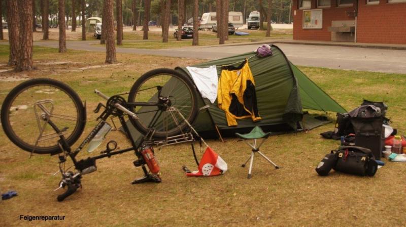 Ich suche mir daher einen geeigneten Zeltplatz, lade mein Fahrrad ab, baue das Zelt auf, stelle das Fahrrad auf den Kopf, lasse die Luft aus dem Schlauch des Hinterrades und baue es aus. Damit gehe ich dann zum Radverleiher. Wir suchen ein ca. 30cm schmales Brettchen, dass wir auf die weniger ausgebeulte Seite der Felge zwischen Felge und Schraubstockbacke legen. Die andere Schraubstockbacke drehe ich vorsichtig gegen die ausgeprägtere Beule. Dieses Vorgehen birgt natürlich die große Gefahr, dass ein ganzes Stück der Seitenflanke abreißt. Daher nehme ich mir zunächst die nicht so stark deformierte von 2 Stellen vor. Es funktioniert! Nichts gerissen, die Seitenflanke sieht wieder gerade aus! Nun kommt die stärker deformierte Stelle dran, doch auch hier geht alles gut. Ich bin glücklich, bedanke mich bei meinem kompetenten Helfer, gehe mit der Felge wieder zum Zeltplatz zurück, baue das Hinterrad ein und kann weitestgehend gut die Felge nachzentrieren. Nun kann ich die Bremsen wieder deutlich enger stellen und sogar über den ganzen Umfang des Laufrades wieder bremsen. Aber dann kommt der Schreck, als ich wieder Luft aufpumpe, drückt sich die stärker deformierte Stelle wieder ein wenig heraus. Ich höre sofort auf und entscheide mich die restliche Strecke dann mit weniger Luftdruck auf dem Hinterrad zu fahren. Ich hatte mir für heute Abend und morgen eine Flasche Merlot gekauft, die ich hälftig an den beiden Tagen genießen wollte. Aber nach dem “leider nur“ Teilerfolg mit der Felge (ist für Ingenieure immer unbefriedigend) verdunstete der Flascheninhalt doch unplanmäßig (haben Ingenieure gelernt mit umzugehen) im Laufe des Abends vollständig. Mit diesem Schlafbeschleuniger war der Übergang in eine ungetrübte Nachtruhe dann doch problemlos zu bewältigen.