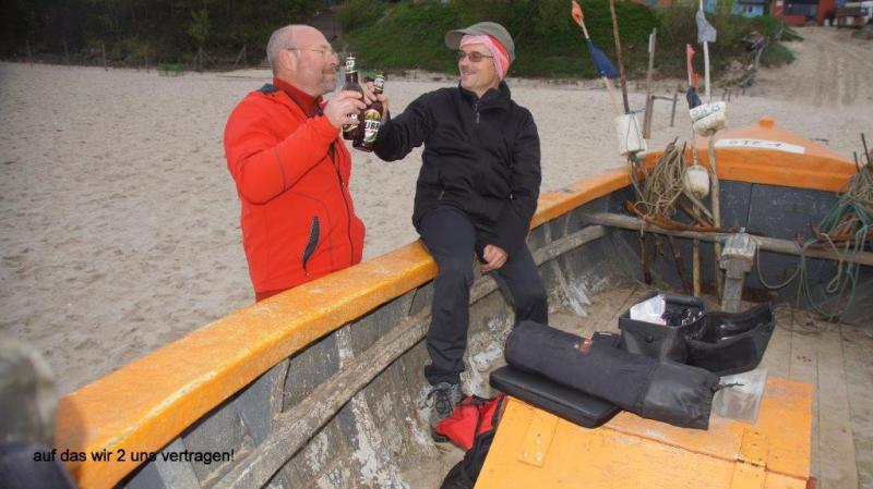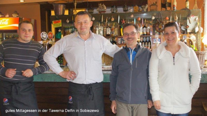 Nach 2 Tagen Pause machte das Fahren wieder so richtig Spaß und nach einer Strecke von ca. 20 km finden wir in Sobieszewo ein einladendes Restaurant mit dem Namen „Tawerna Delfin“. Der Gastwirt empfängt uns bereits am Gartentor auf Deutsch und fragt nach unseren Wünschen. Das Essen war wirklich exquisit und Heiner meint, dies sei das beste Restaurant bisher. Auch die Inneneinrichtung mit einem großen Kamin war sehr ansprechend. Ich machte noch ein Foto mit der ganzen Familie und dann ging es weiter bis unser Weg an dem Fluss Prezekop abrupt endete. Wir sahen aber eine Fähre auf der anderen Seite des sicher 1 km breiten Flussdeltas. Ein dreijähriger Junge mit Namen Robert unterhielt uns und wollte auch gerne aufs Foto. In Stegna dem Tor zur „Frischen Nehrung“ fanden wir einen schönen kleinen Campingplatz nahe an der Küste. Die Chefin bot uns einen kleinen Campingwagen an mit der Bemerkung, in der Nacht würde es sicher sehr kalt und vielleicht sogar regnen. Wir nahmen das Angebot gerne an – brauchten wir doch mal kein Zelt auf und ab zu bauen – und konnten schnell noch zum Strand fahren. Dort haben wir uns dann in ein altes Schifferboot gesetzt (siehe Foto!) mit einem kleinen Abendtrunk und unser Tagebuch geschrieben. Aufregung gab es noch nach der Rückkehr auf den Campingplatz, als Heiner vermeintlich sein Handy verloren glaubte. Zum Glück fand es sich aber im Wohnwagen wieder.